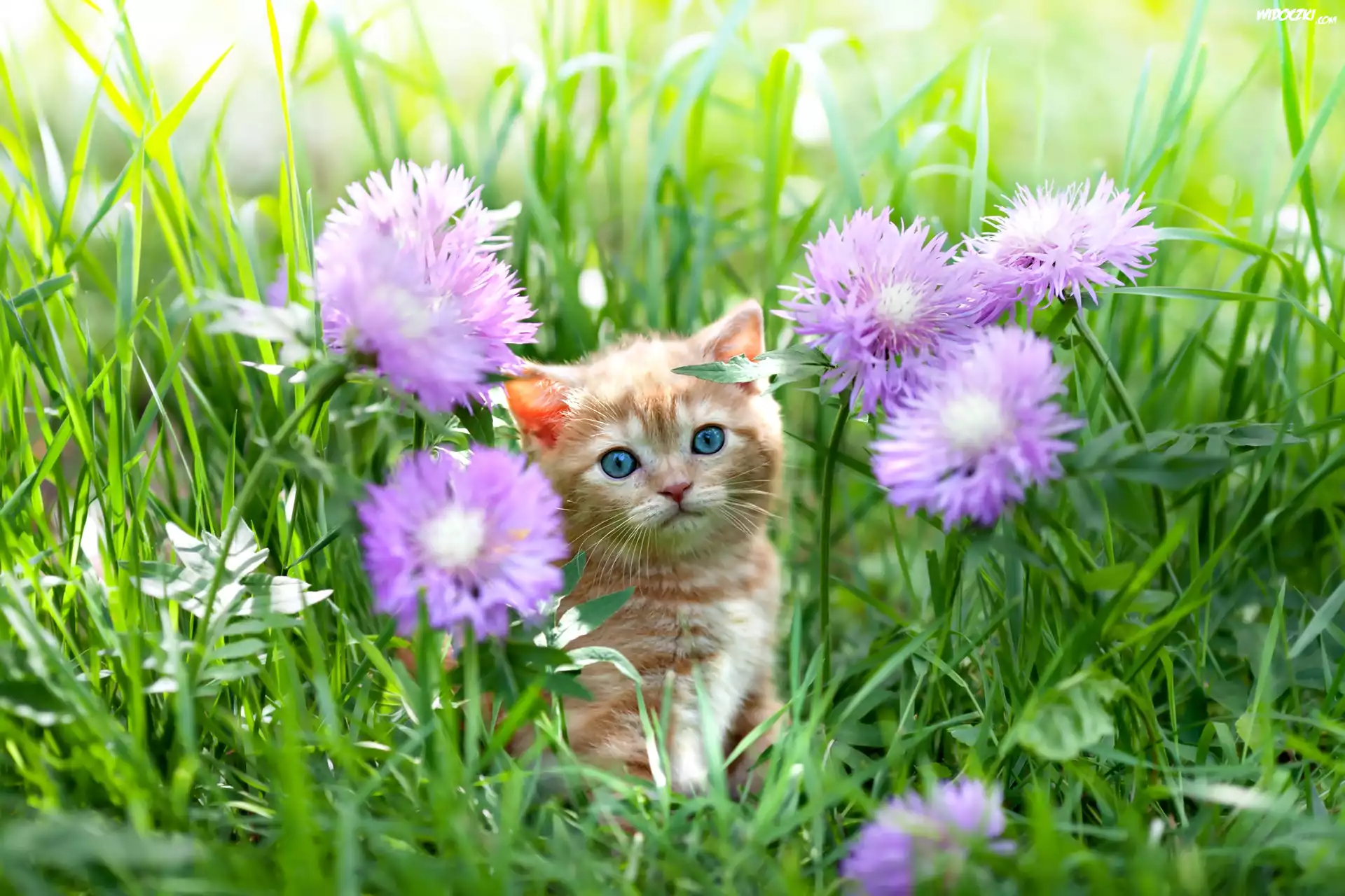 Słodki, Kotek, Łąka, Kwiaty, Wiosna