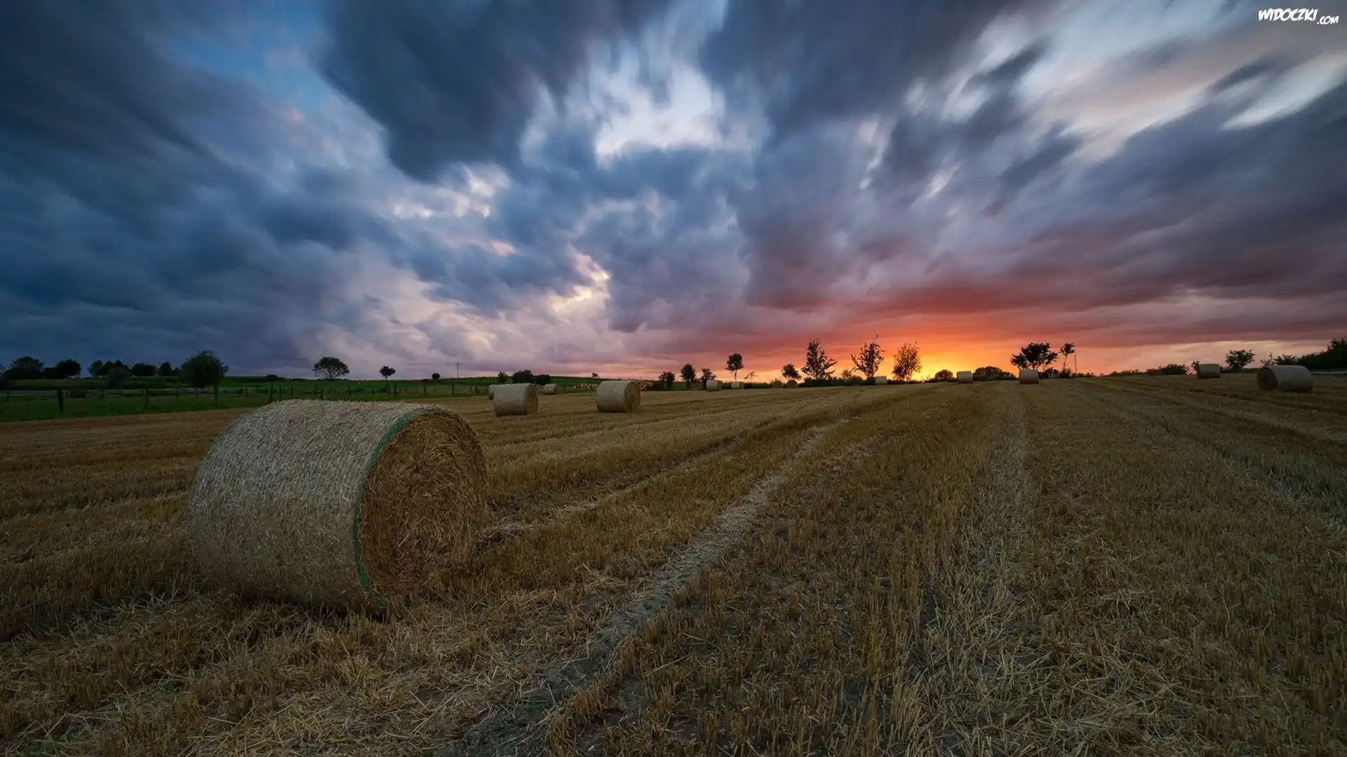Zdjęcia, Pole, Słoma, Bele, Drzewa, Zachód słońca, Chmury