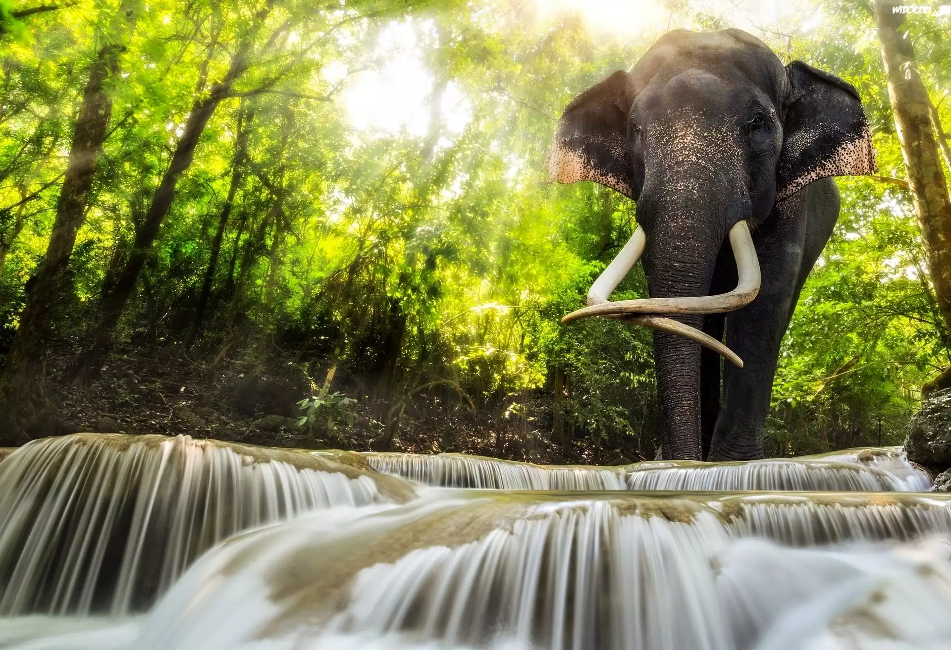 Słoń, Las, Przebijające Światło, Rwąca Rzeka