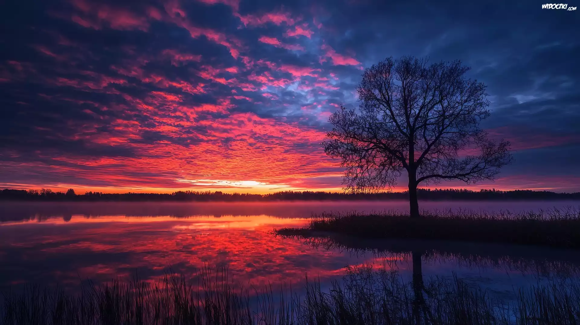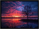 Zdjęcia, Jezioro, Drzewo, Zachód słońca, Grafika AI
