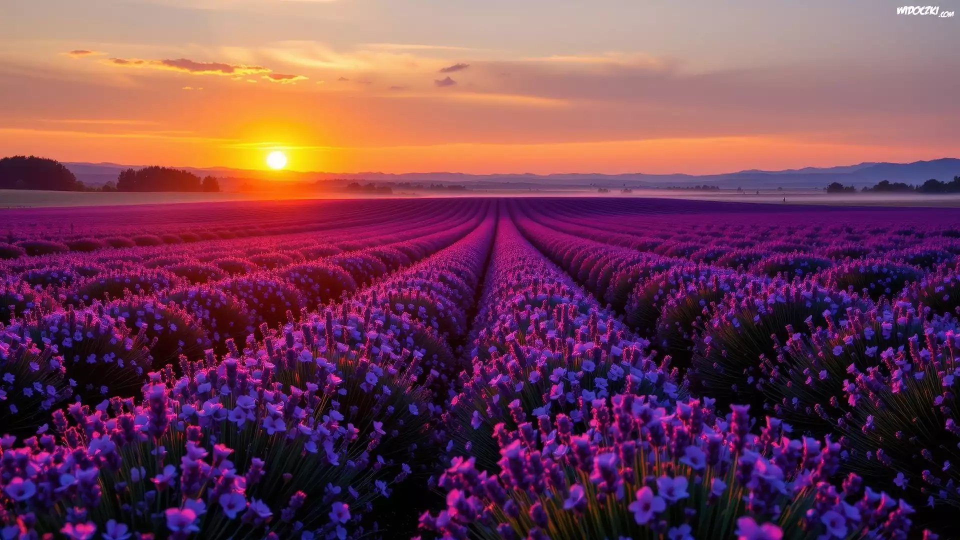 Zdjęcia, Lawenda, Pole, Zachód słońca, Drzewa, AI