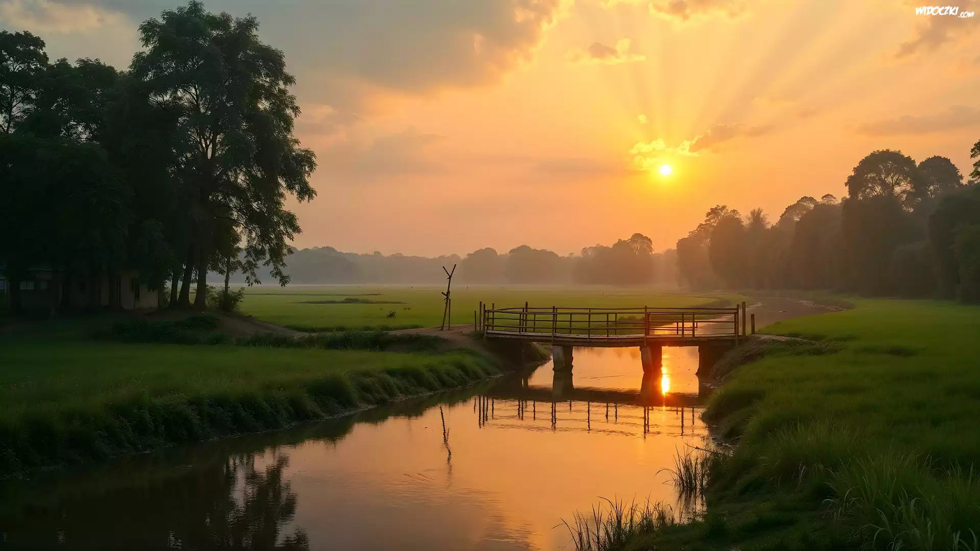 Zdjęcia, Rzeka, Most, Zachód słońca, Drzewa, AI