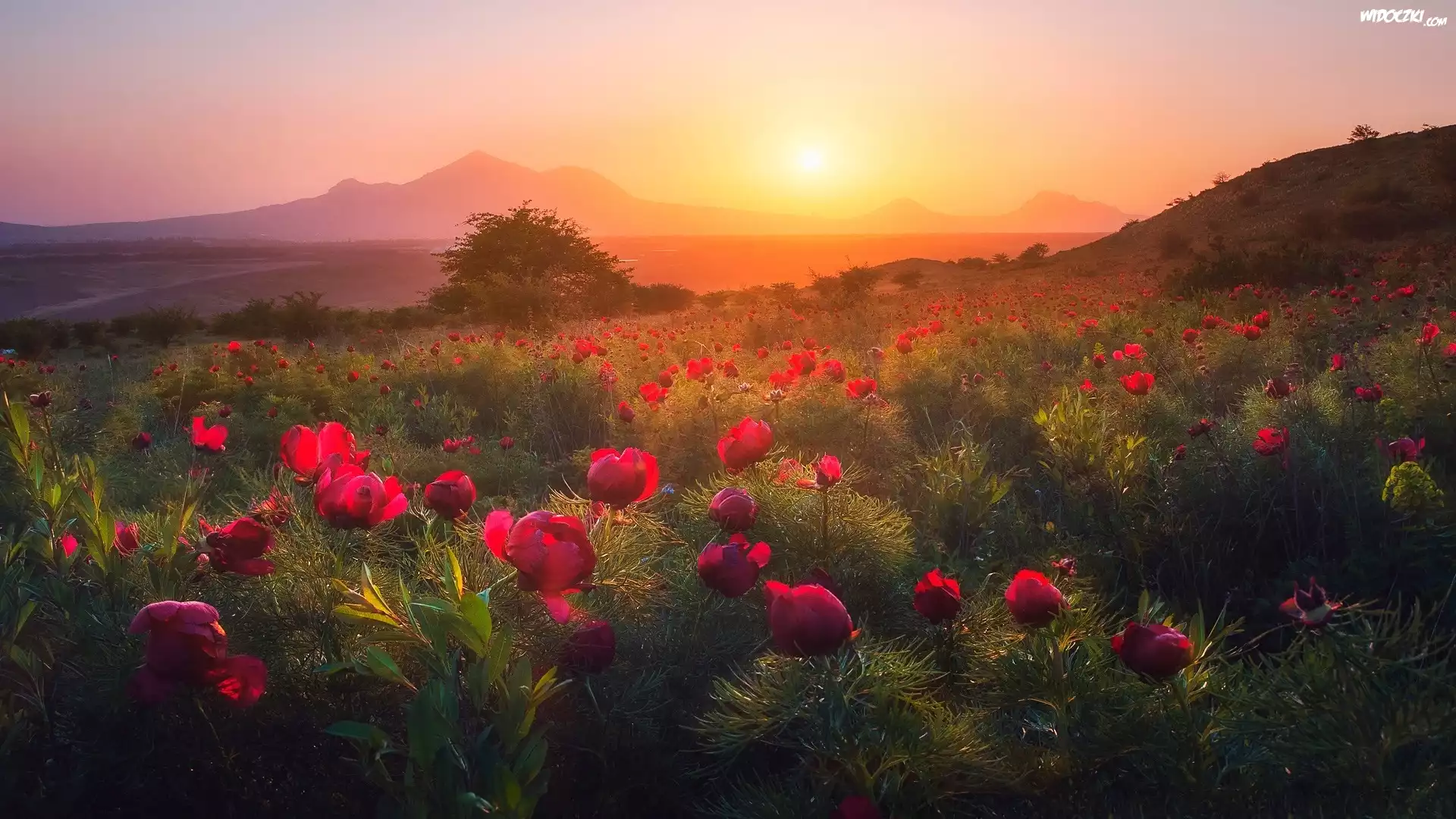 Zdjęcia, Zachód słońca, Góry, Pole, Drzewo, Kwiaty, Piwonie, Łąka