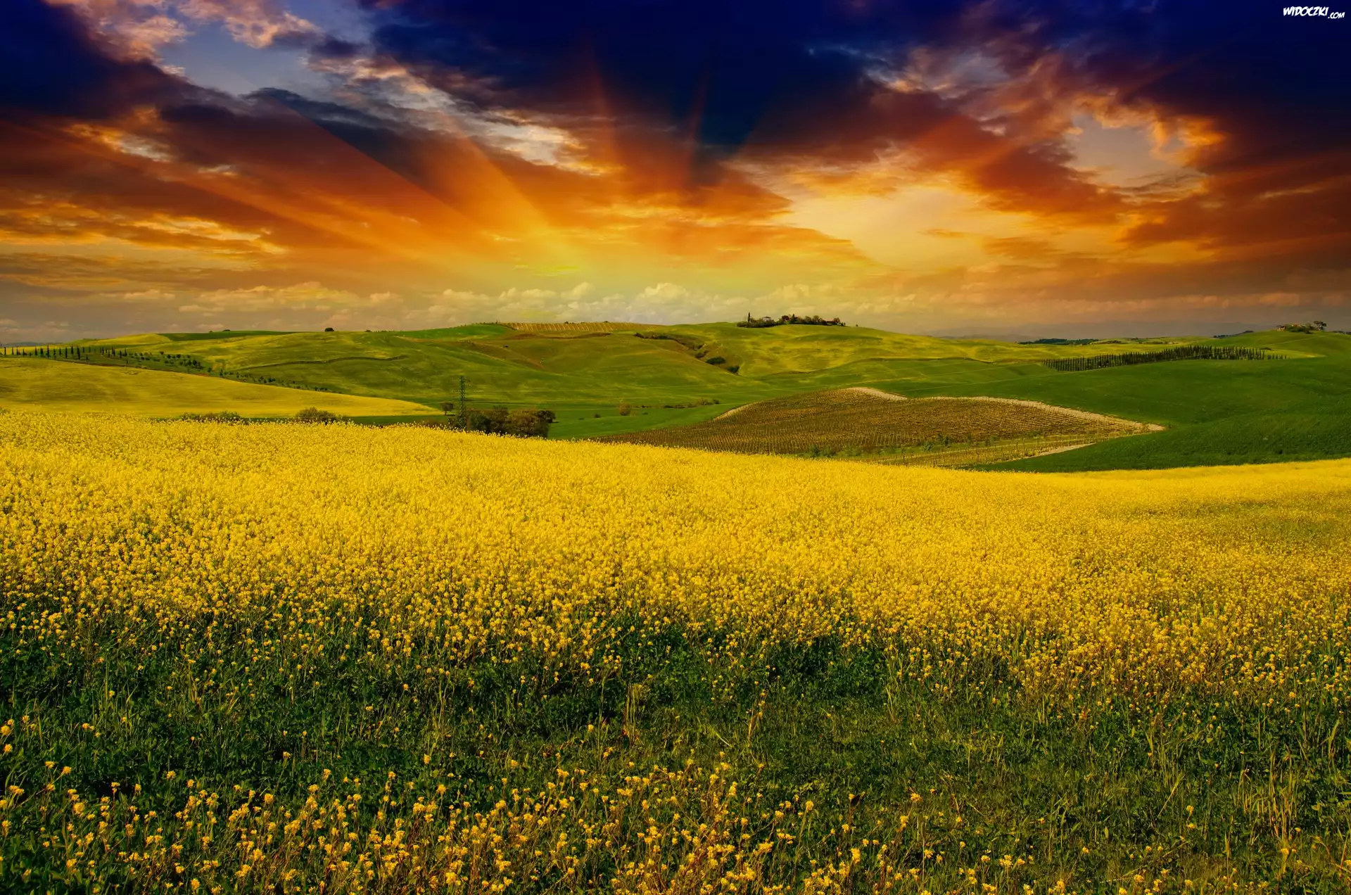 Zdjęcia, Włochy, Toskania, Łąki, Kwiaty, Plantacje, Domy, Chmury, Promienie słońca