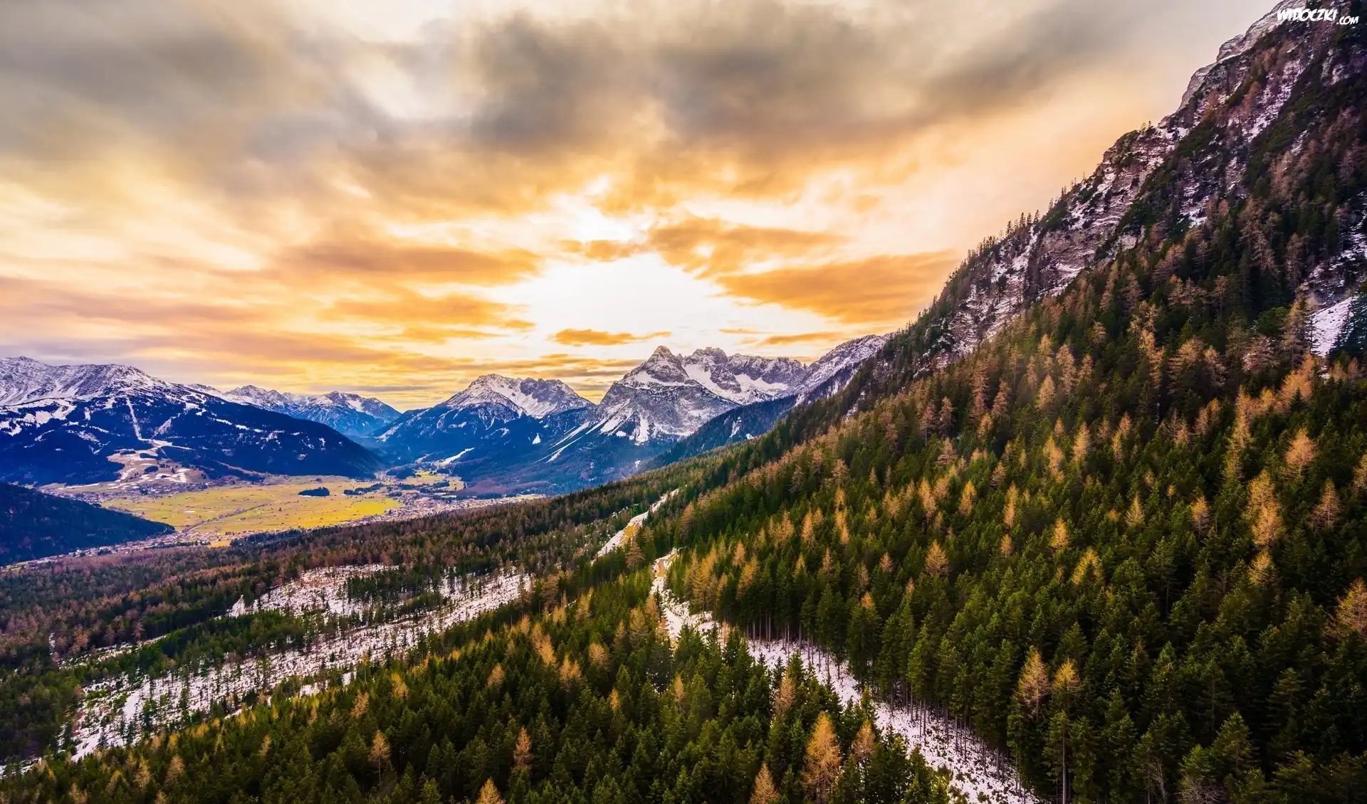 Zdjęcia, Austria, Góry Alpy, Ośnieżone, Szczyty, Las, Chmury, Wschód słońca