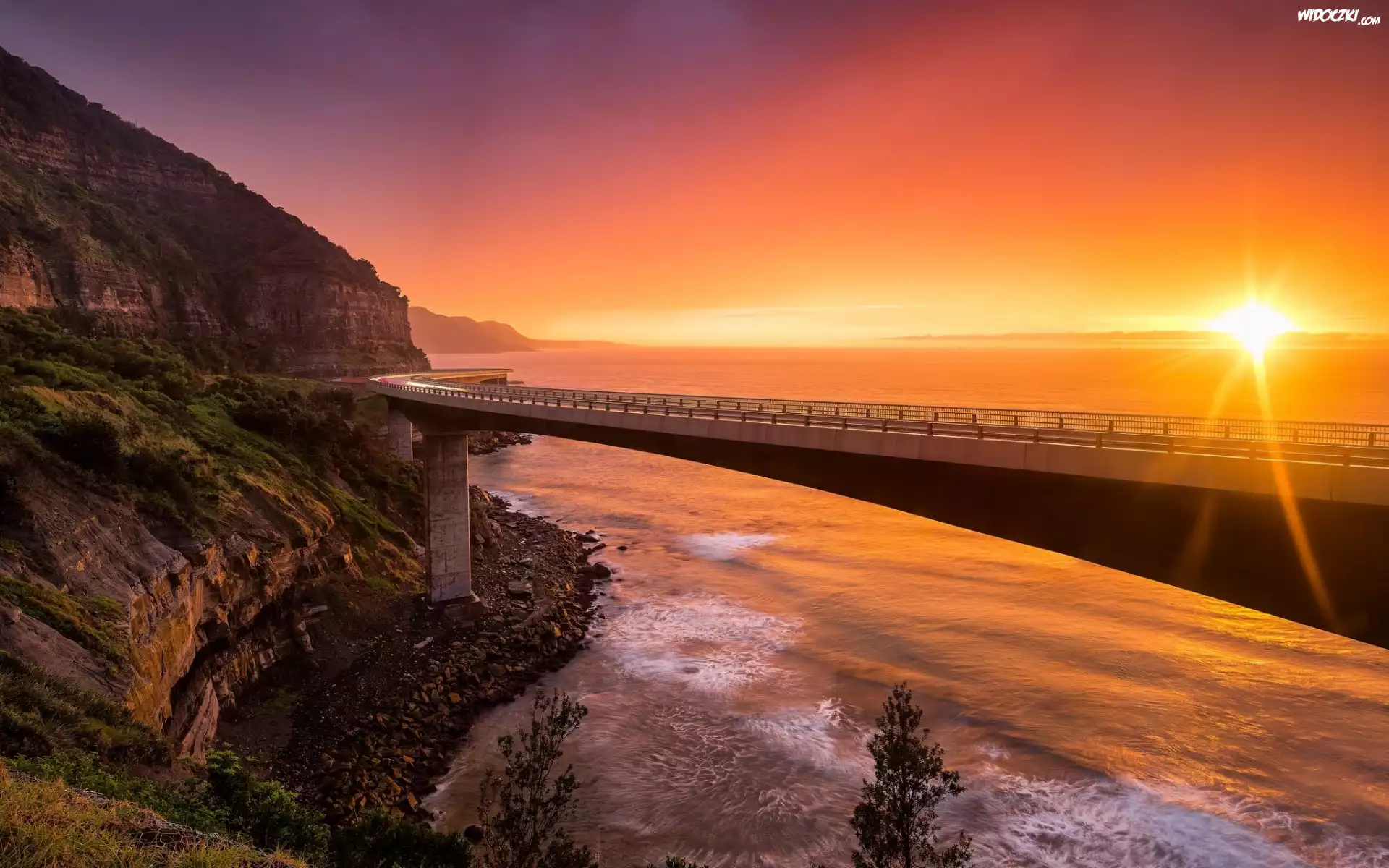Zdjęcia, Australia, Nowa Południowa Walia, Zachód słońca, Most Sea Cliff Bridge, Klif, Morze