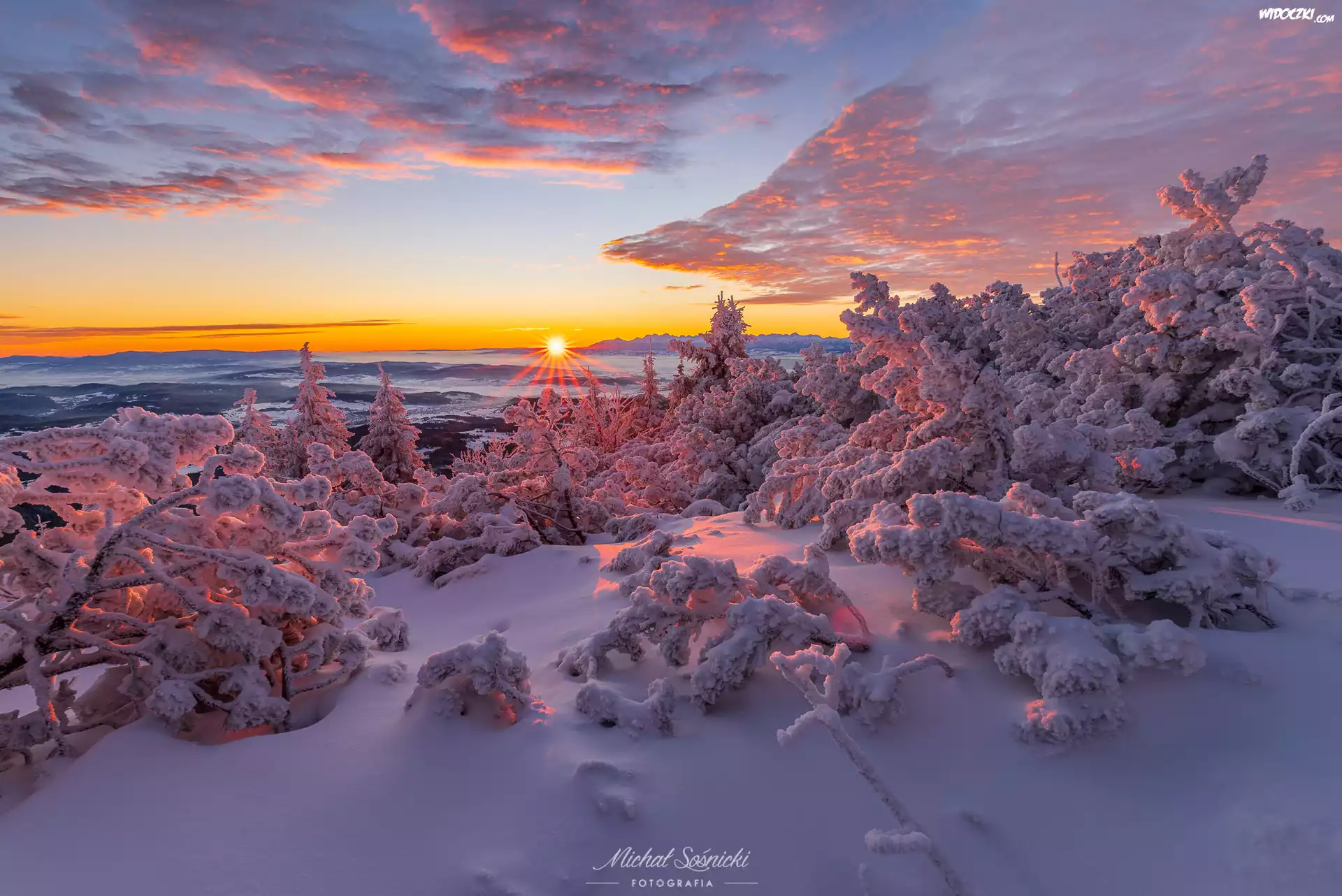 Zima, Drzewa, Śnieg, Krzewy, Niebo, Wschód słońca, Babiogórski Park Narodowy, Polska
