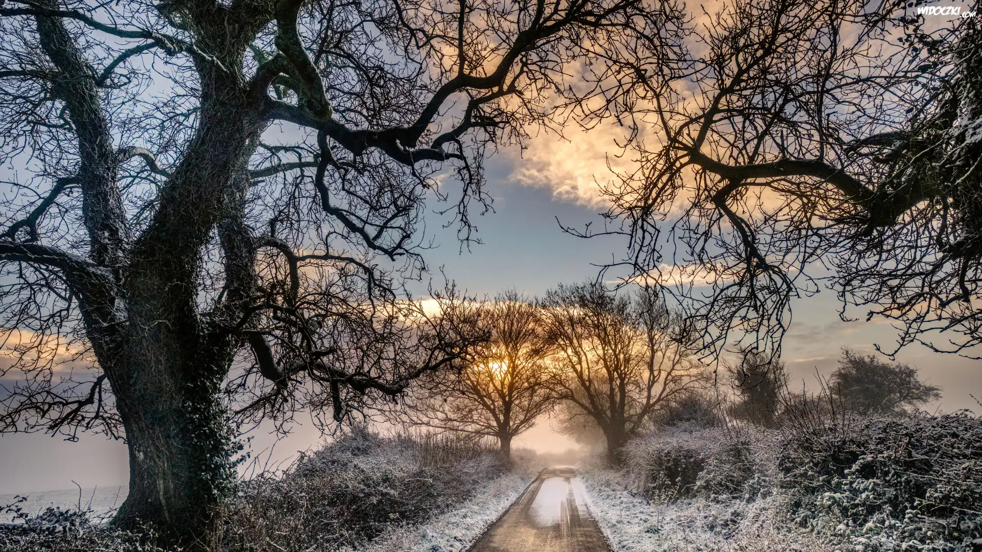 Zima, Droga, Bezlistne, Drzewa, Oszronione, Krzewy, Mgła, Zachód słońca