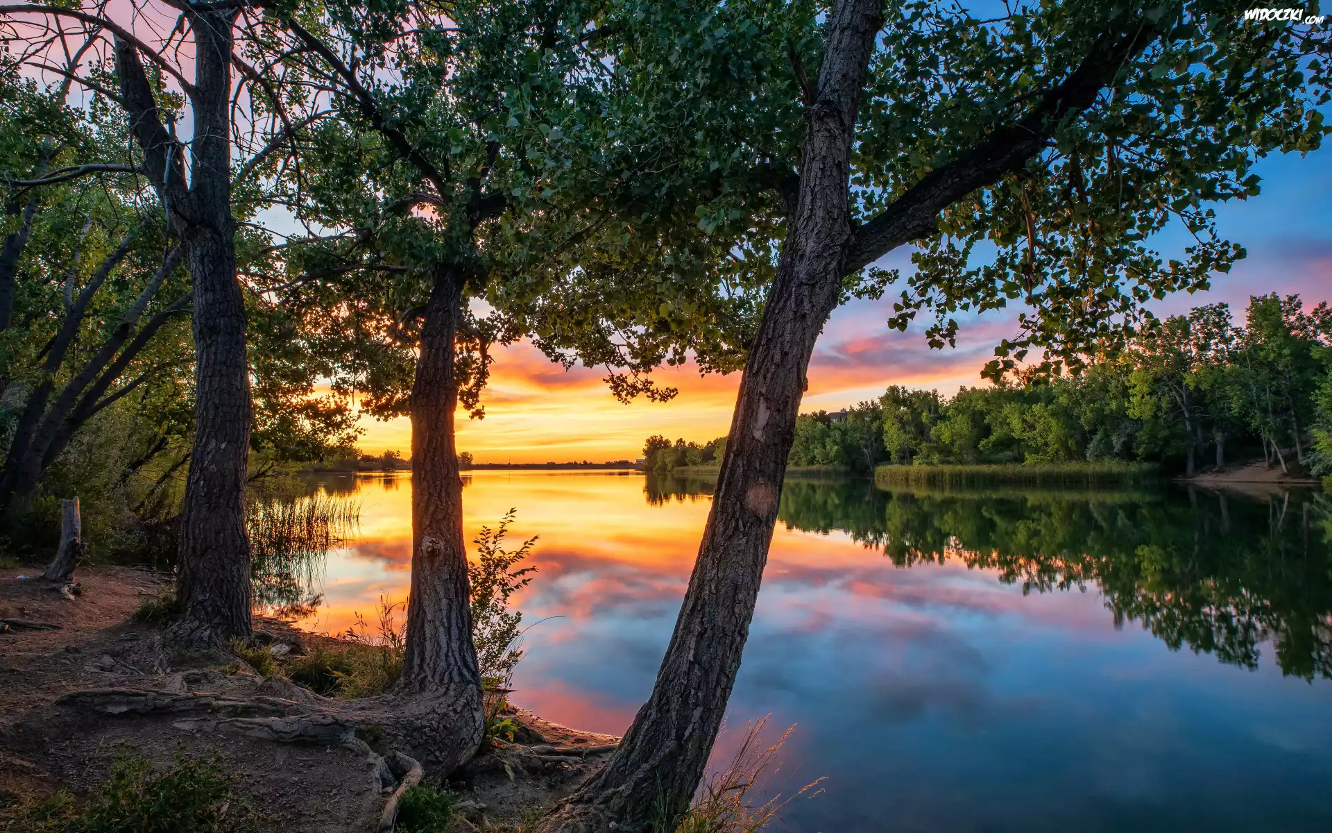 Zdjęcia, Las, Drzewa, Brzeg, Jezioro, Gałęzie, Niebo, Zachód słońca