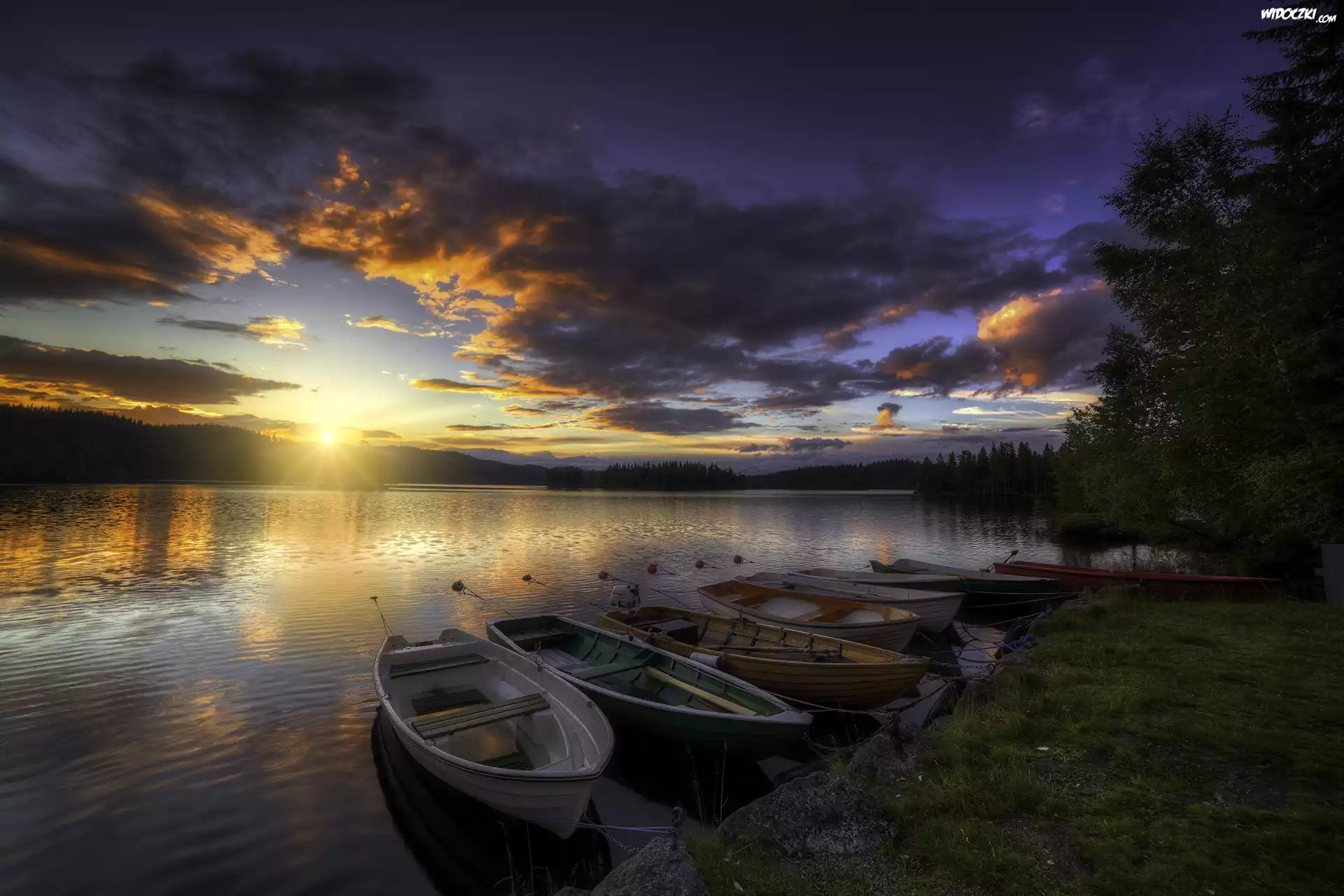 Zdjęcia, Jezioro, Łódki, Brzeg, Trawa, Drzewa, Wieczór, Chmury, Zachód słońca