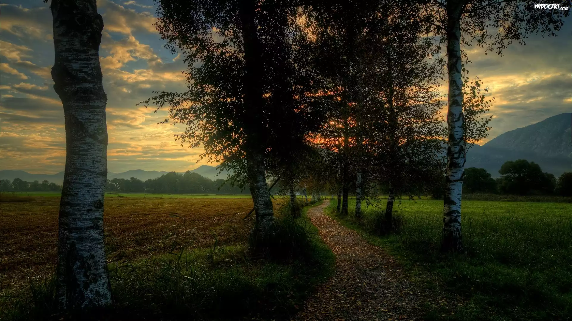 Wschód słońca, Mgła, Góry, Pola, Droga, Drzewa, Brzozy