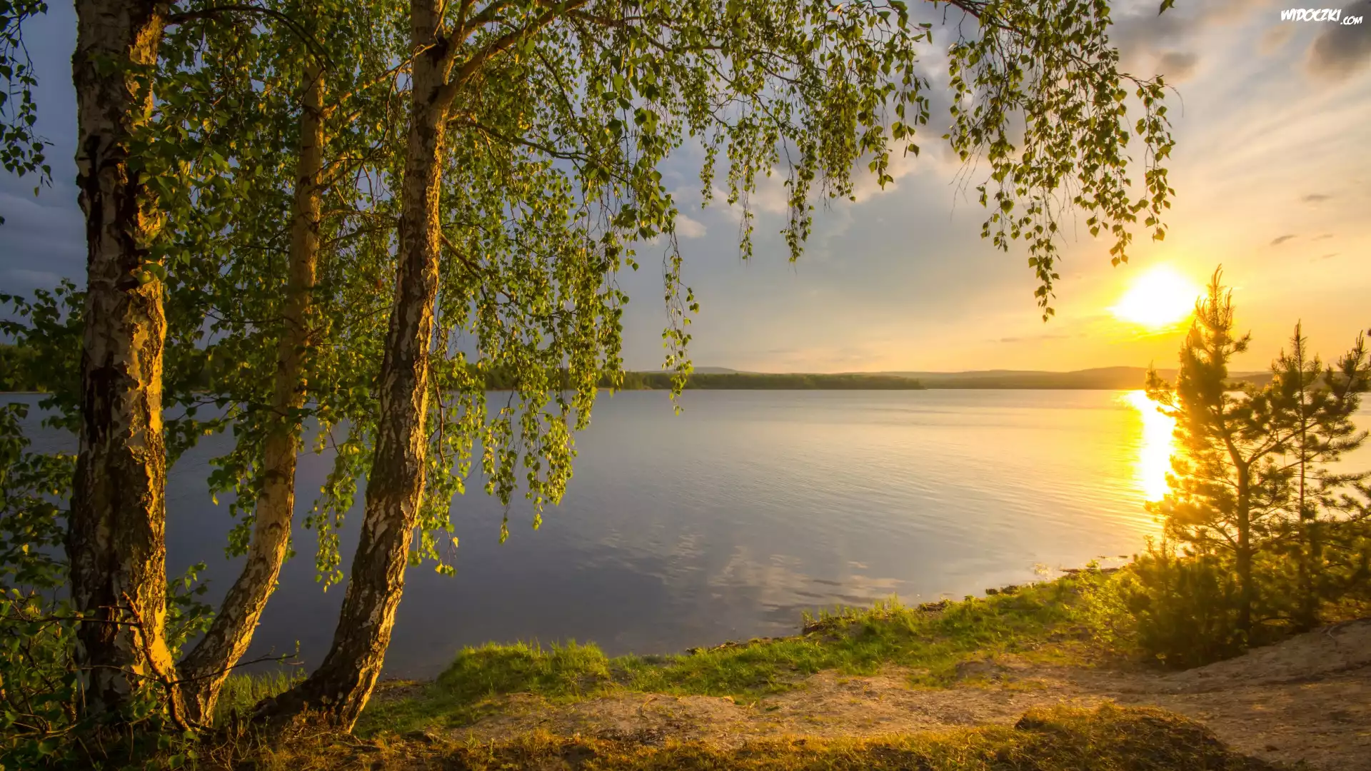 Zdjęcia, Brzozy, Jezioro, Zachód słońca