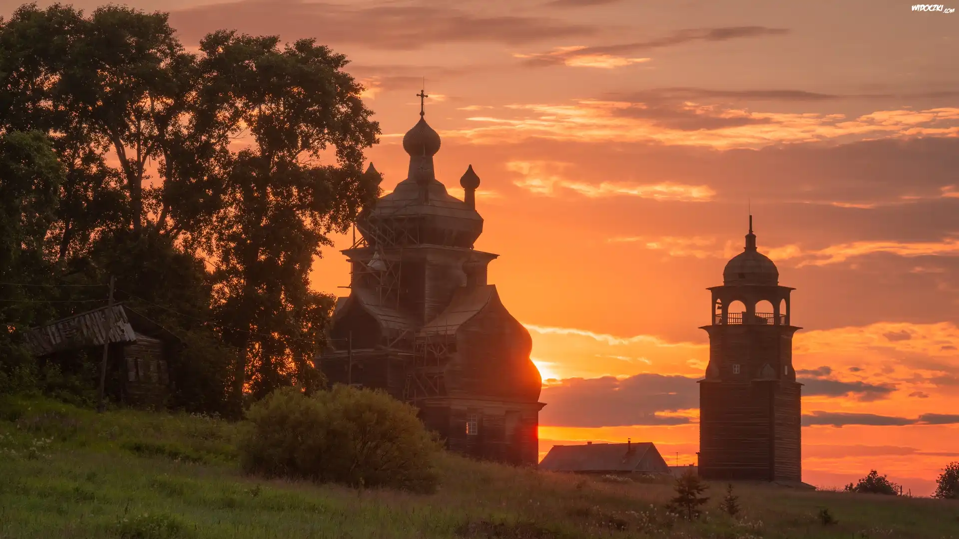 Zdjęcia, Zachód słońca, Cerkiew, Dzwonnica, Drzewa