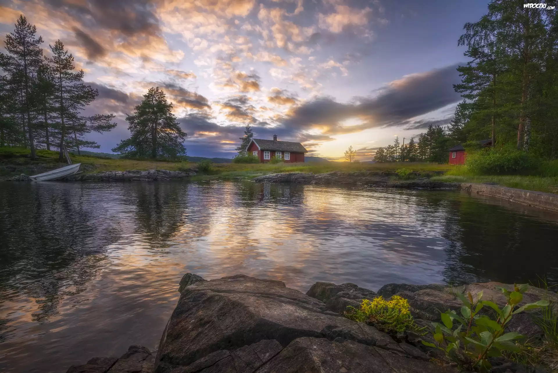 Norwegia, Ringerike, Jezioro Vaeleren, Chmury, Drzewa, Łódka, Dom, Wschód słońca