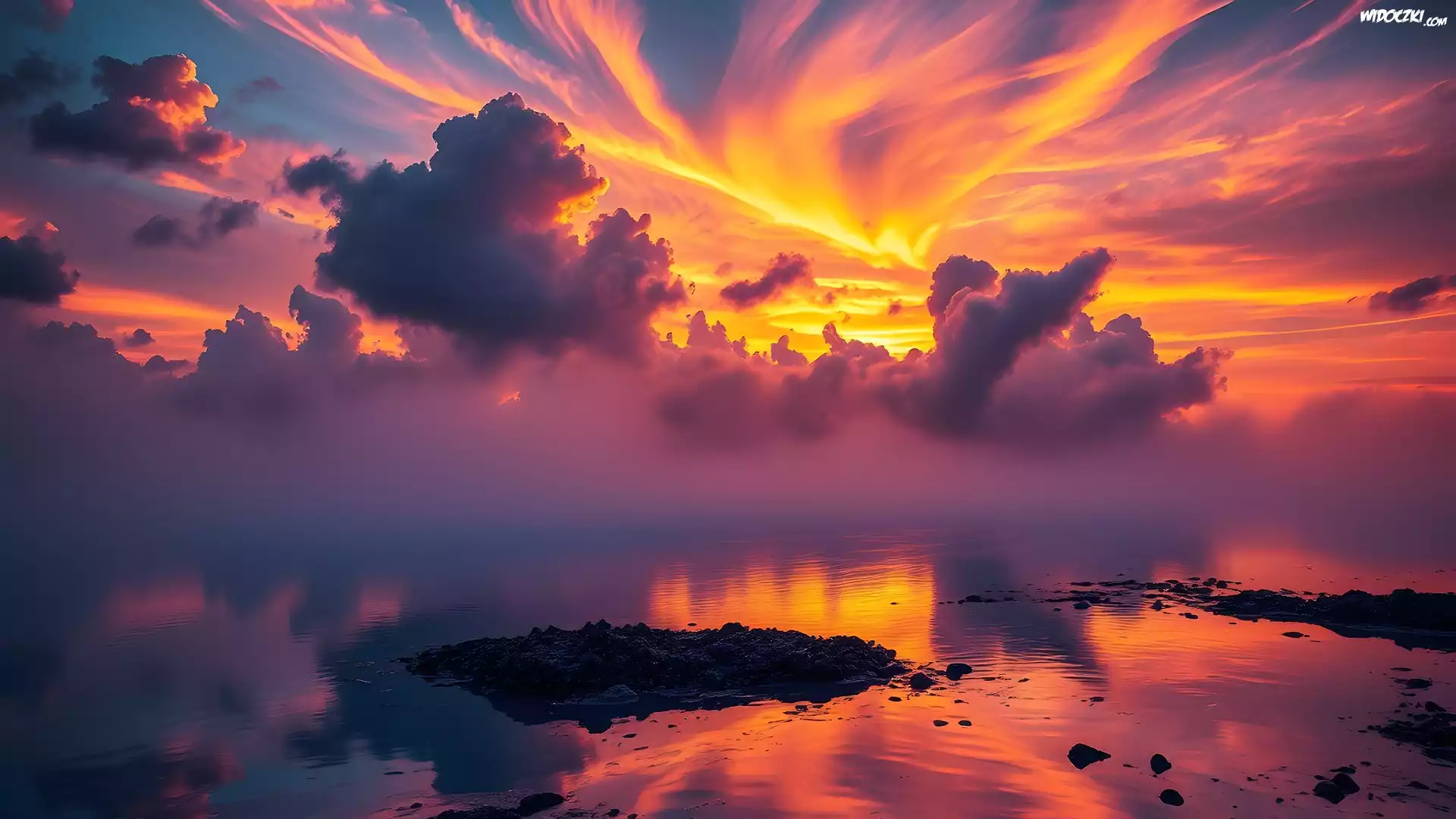 Kolorowe, Niebo, Chmury, Mgła, Jezioro, Skały, Zachód słońca