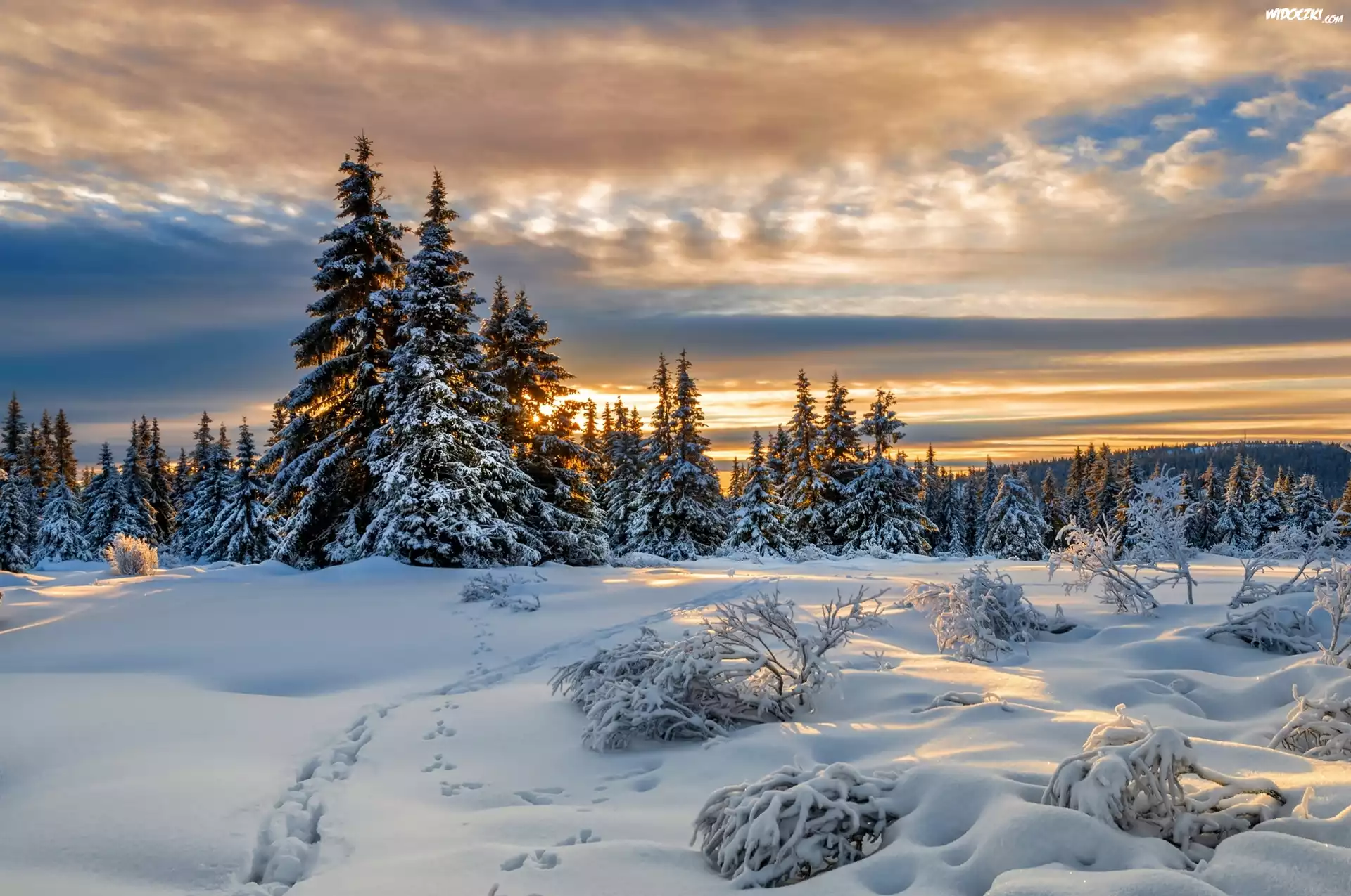 Zdjęcia, Świerki, Chmury, Zachód słońca, Zima