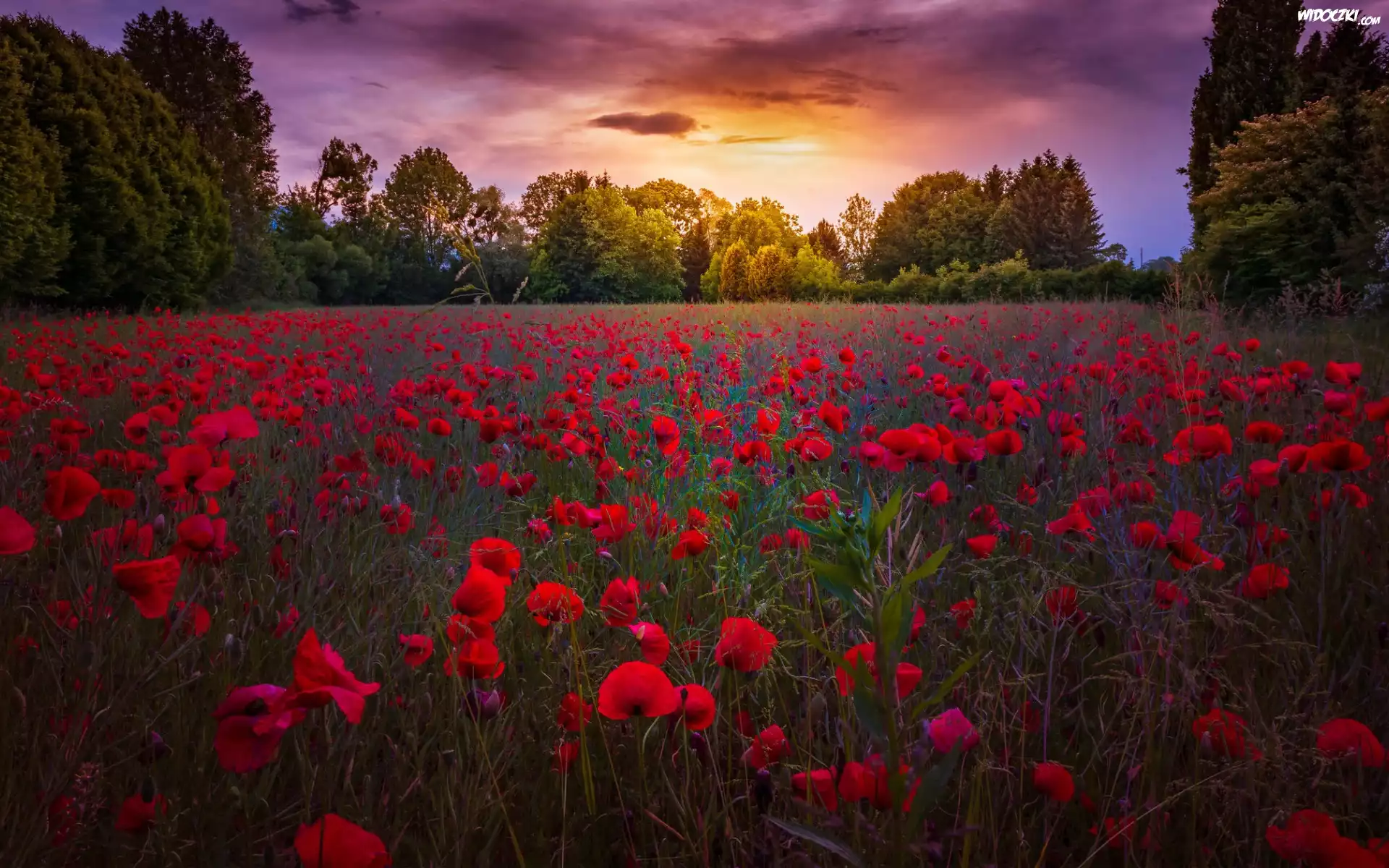 Pole, Maki, Czerwone, Łąka, Drzewa, Chmury, Zachód słońca