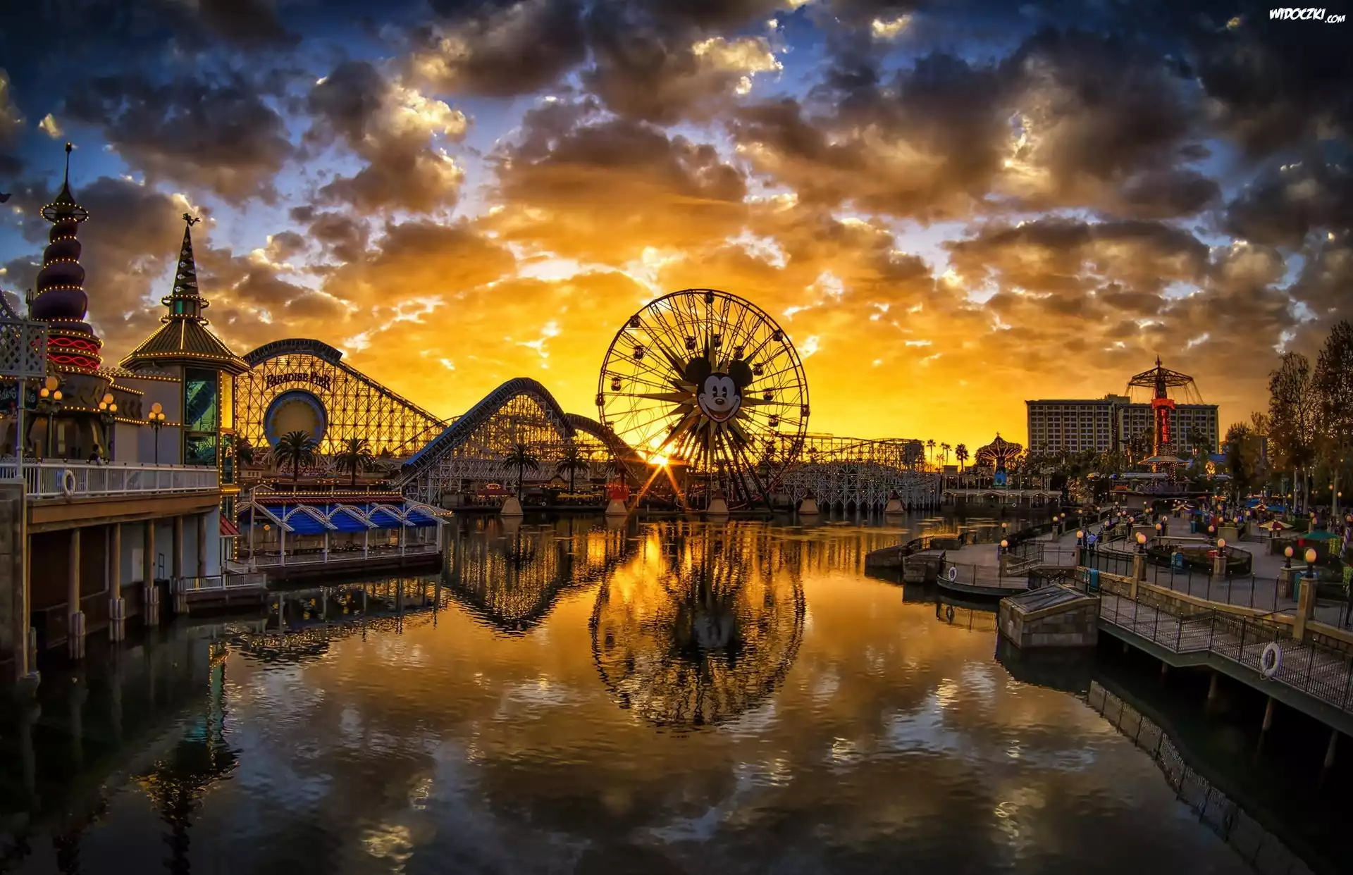 Zdjęcia, Stany Zjednoczone, Kalifornia, Anaheim, Disneyland, Diabelski młyn, Rzeka, Zachód słońca