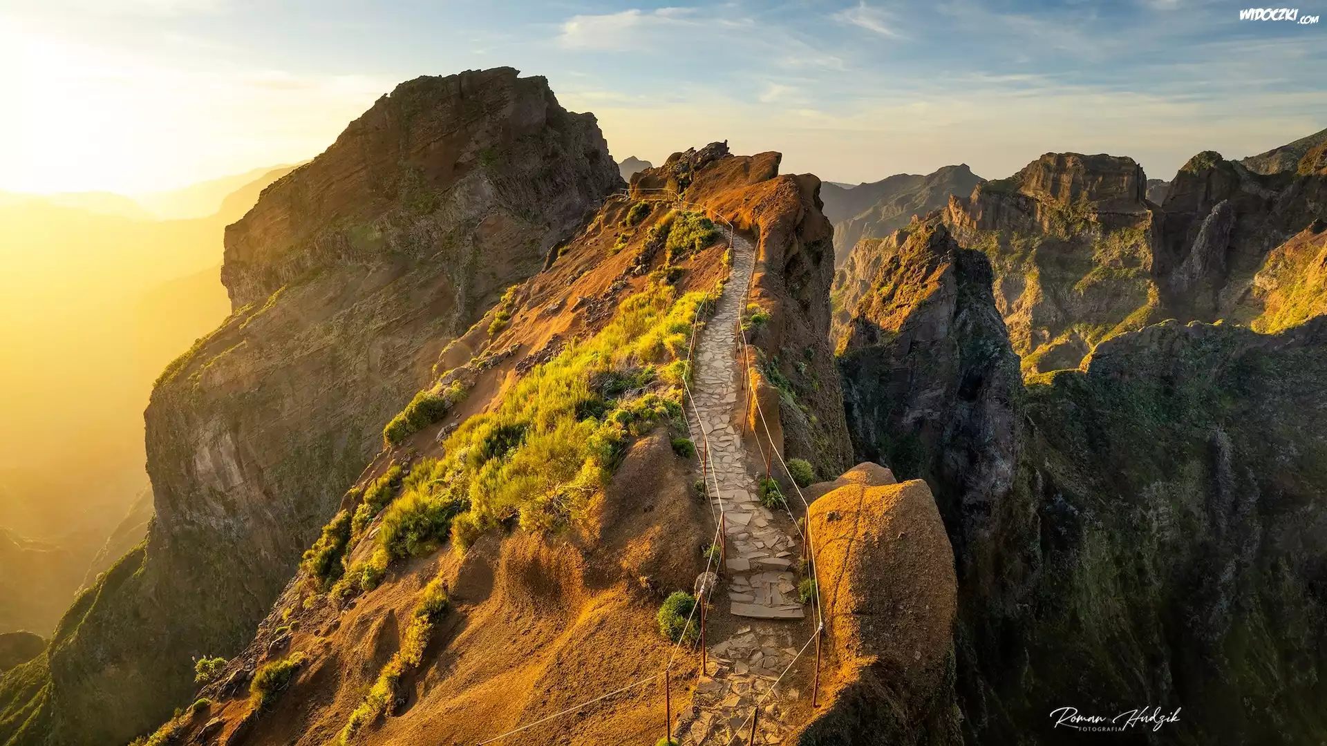 Portugalia, Madera, Góry, Pico Rija, Zachód słońca, Droga, Kamienna, Szlak wędrowny