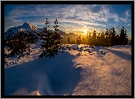 Zima, Góry, Drzewa, Zaspy, Śnieg, Niebo, Zachód słońca