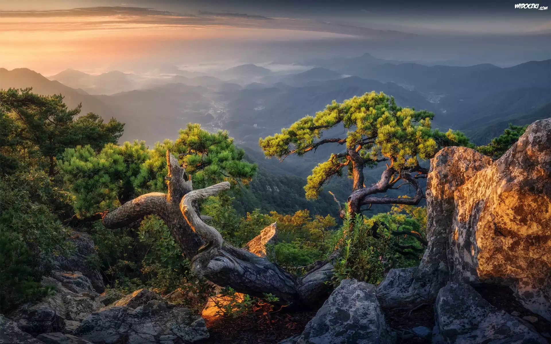Zdjęcia, Góry, Skały, Drzewa, Sosny, Kamienie, Chmury, Wschód słońca