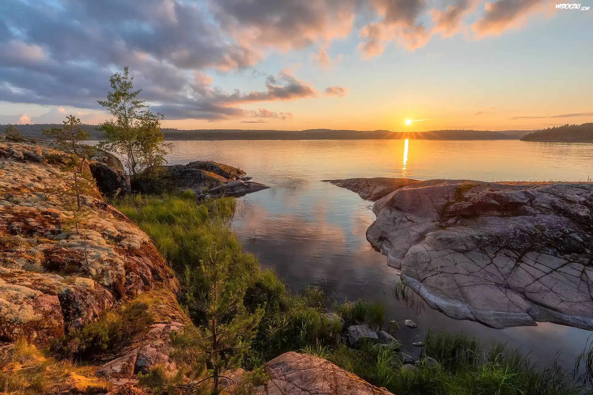Zdjęcia, Jezioro, Skały, Drzewa, Wyspa, Niebo, Zmierzch, Zachód słońca