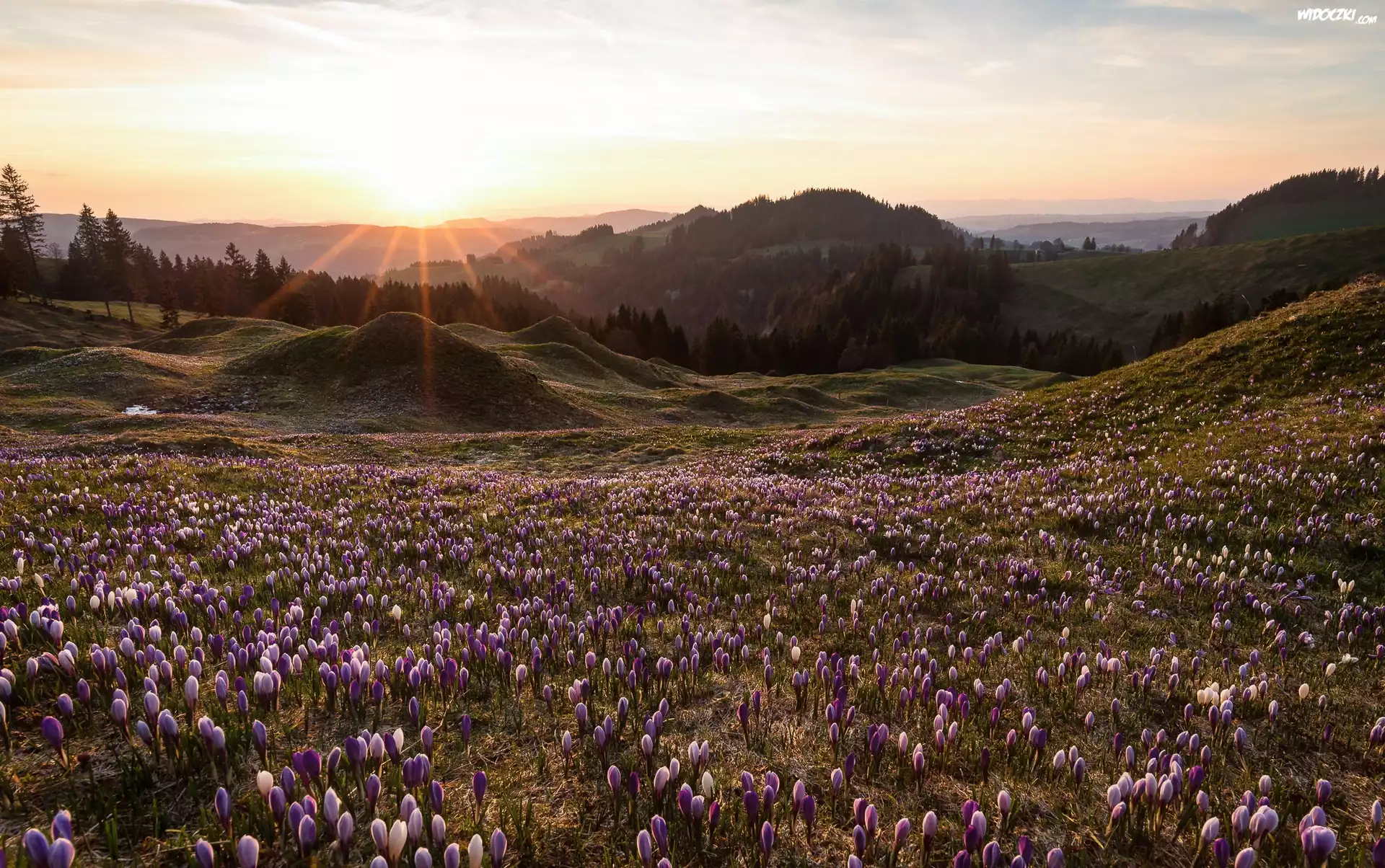 Wschód słońca, Łąka, Kwiaty, Krokusy, Zalesione, Wzgórza, Drzewa