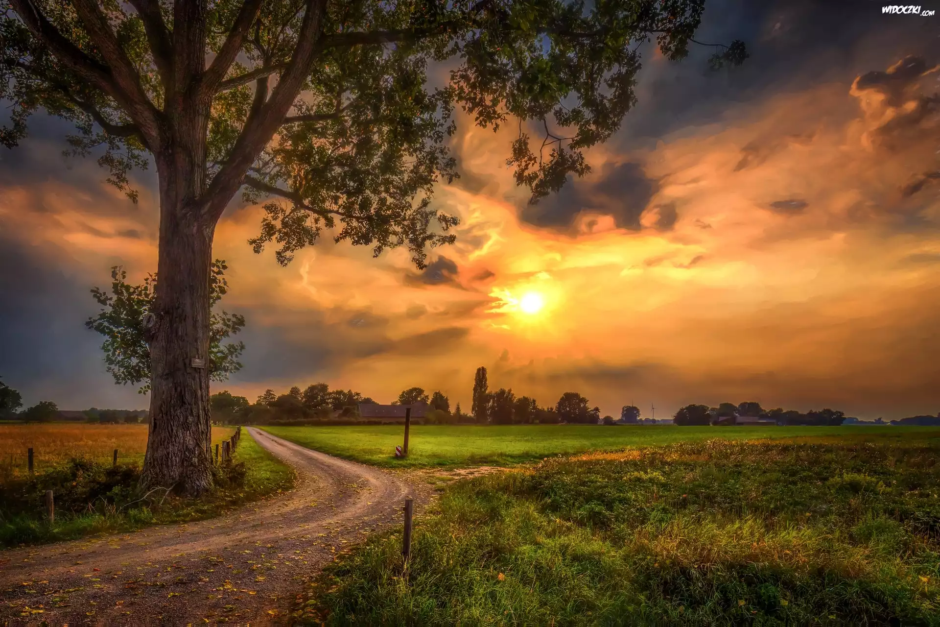 Zdjęcia, Droga, Pole, Drzewo, Trawa, Niebo, Chmury, Zachód słońca