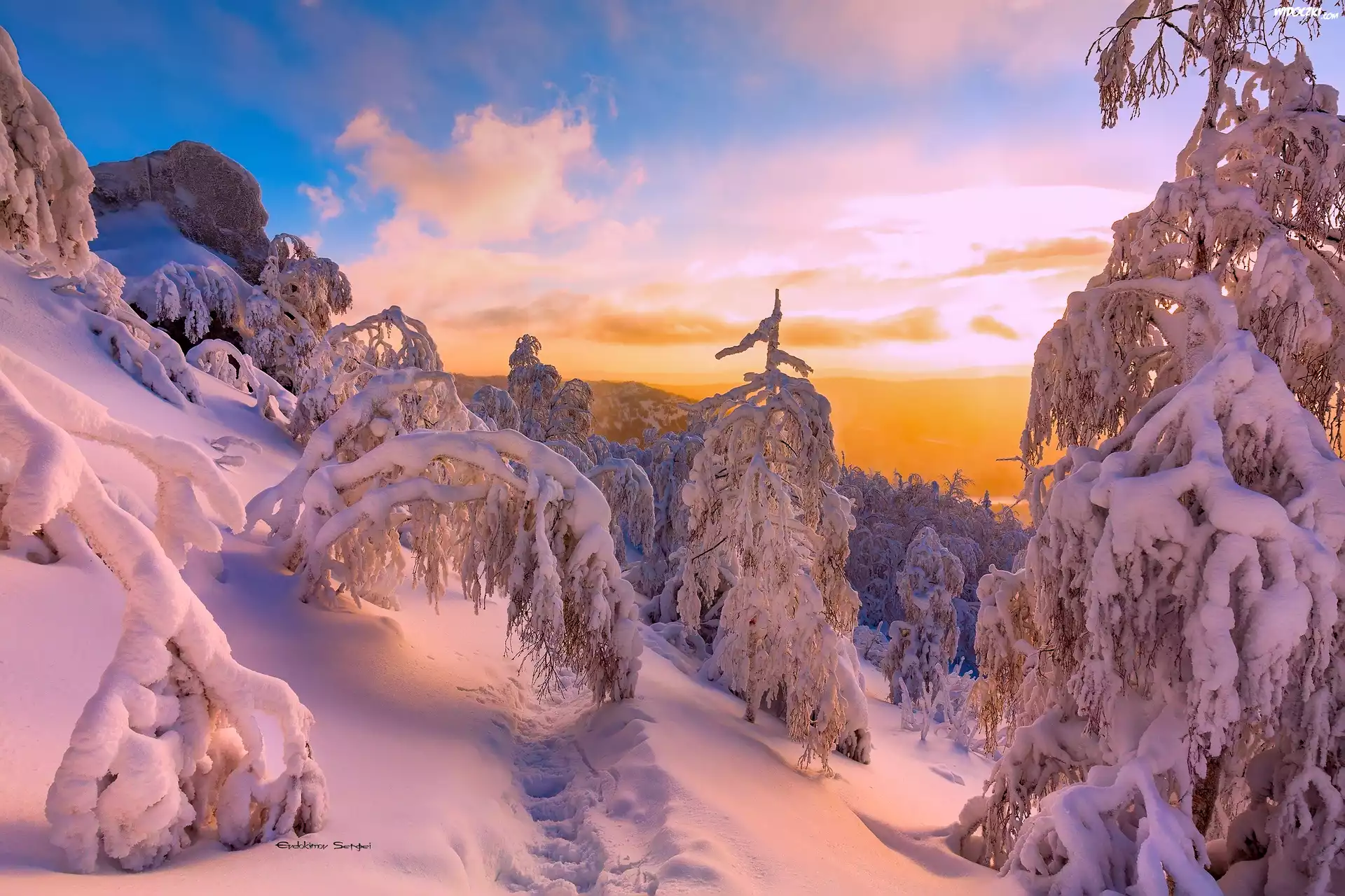 Zdjęcia, Zima, Wzgórze, Góry, Ośnieżone, Drzewa, Ścieżka, Zachód słońca