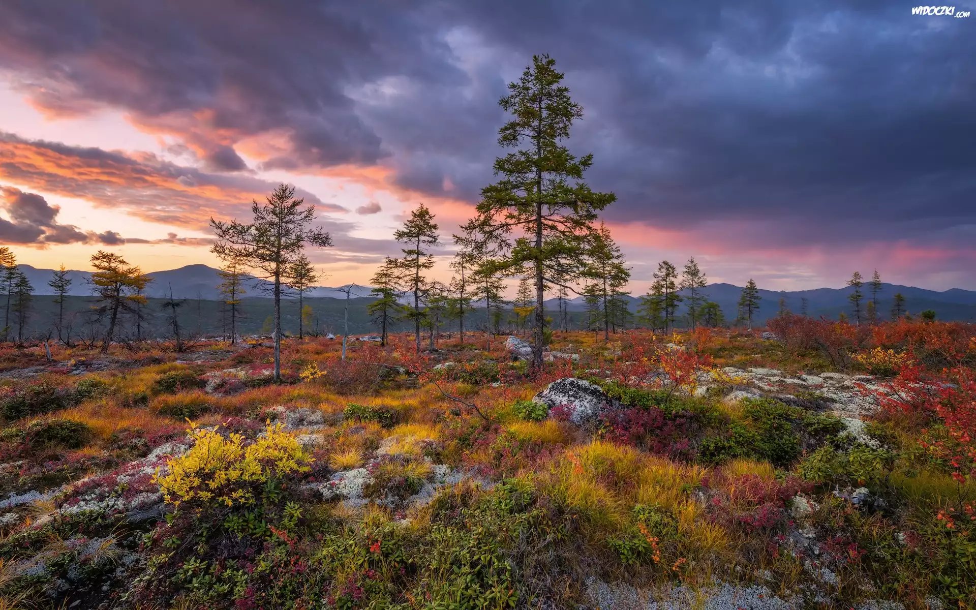 Rosja, Kołyma, Jesień, Drzewa, Roślinność, Góry, Zachód słońca