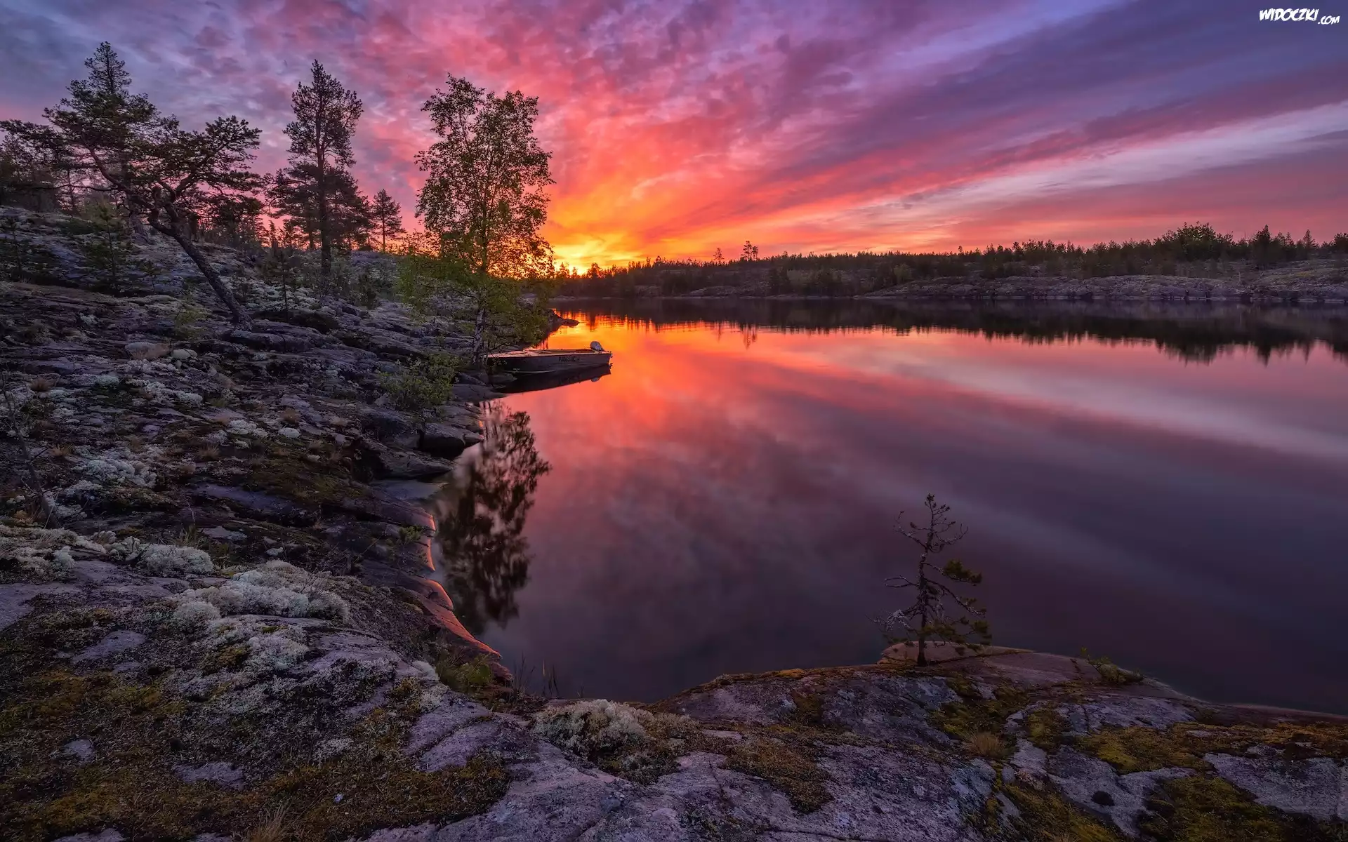 Rosja, Karelia, Jezioro, Ładoga, Skały, Drzewa, Zachód słońca
