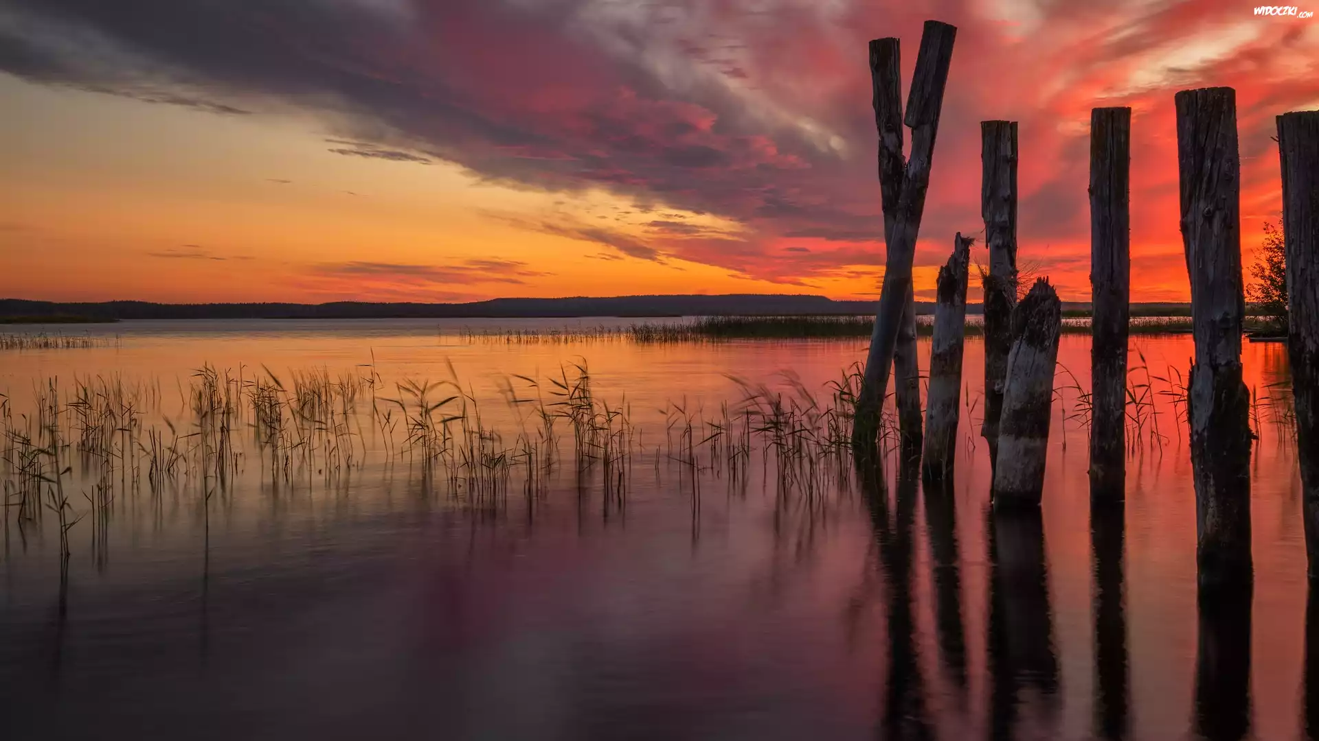 Zdjęcia, Rosja, Karelia, Jezioro, Ładoga, Szuwary, Pale, Zachód słońca