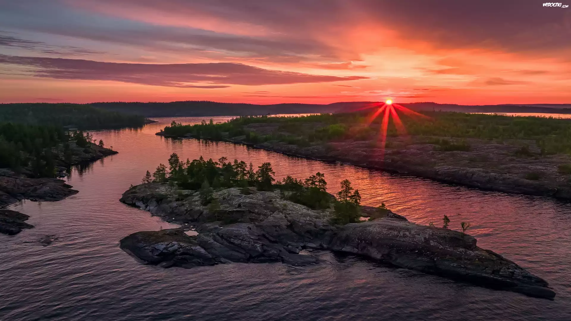 Rosja, Karelia, Jezioro, Ładoga, Wyspy, Drzewa, Wschód słońca