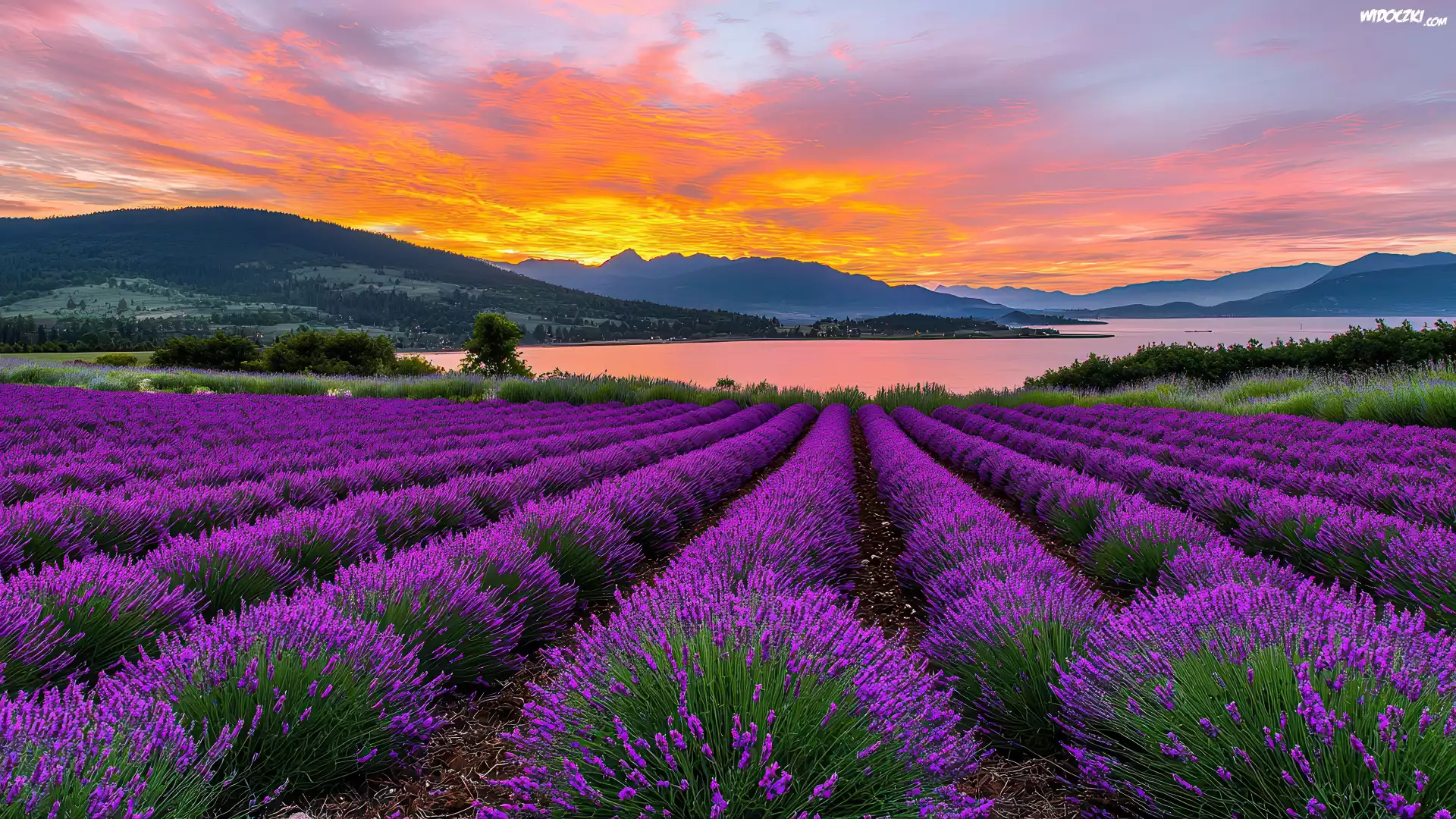 Zdjęcia, Pole, Lawenda, Jezioro, Góry, Niebo, Chmury, Zachód słońca