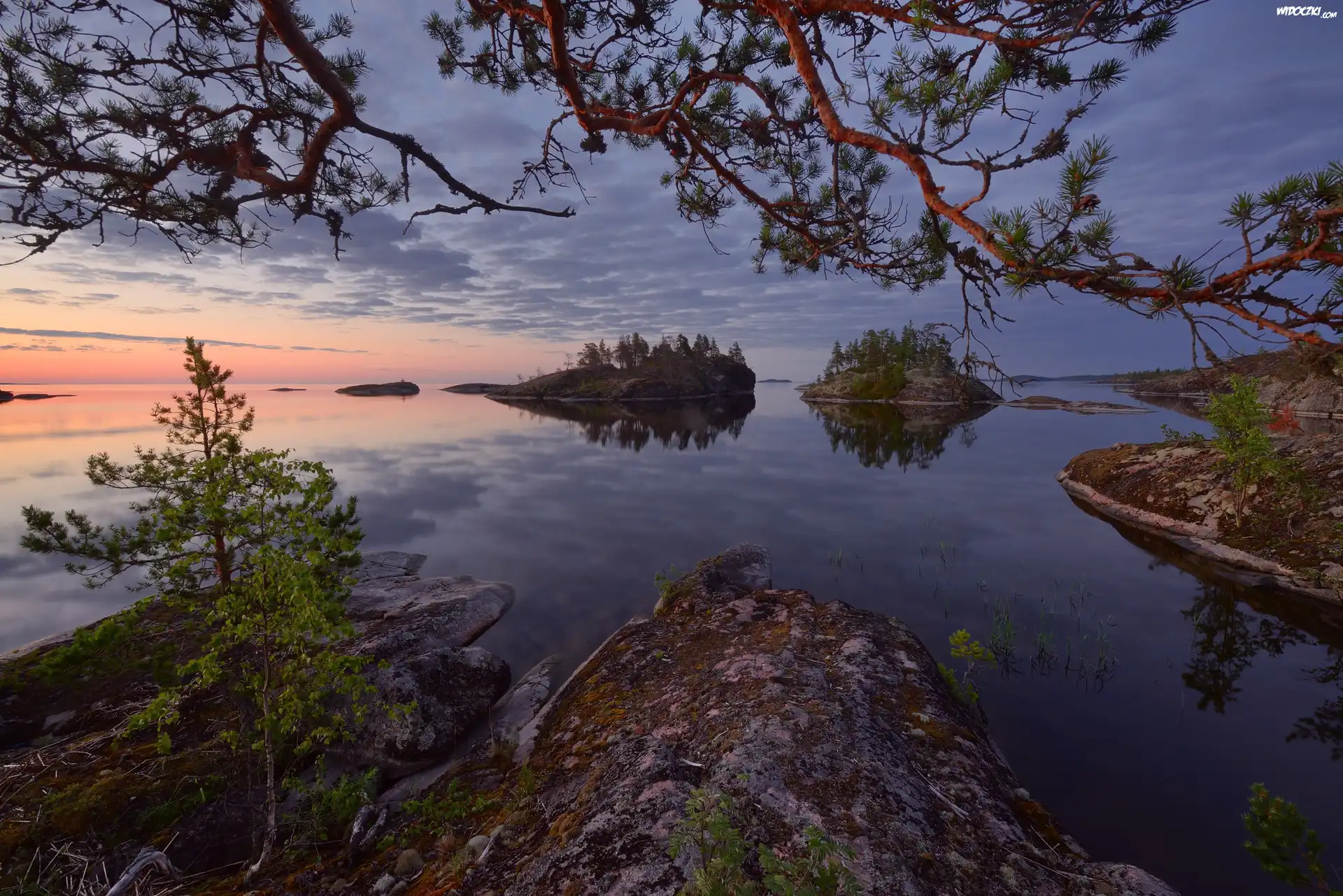 Jezioro Ładoga, Karelia, Rosja, Drzewa, Skały, Wysepki, Wschód słońca