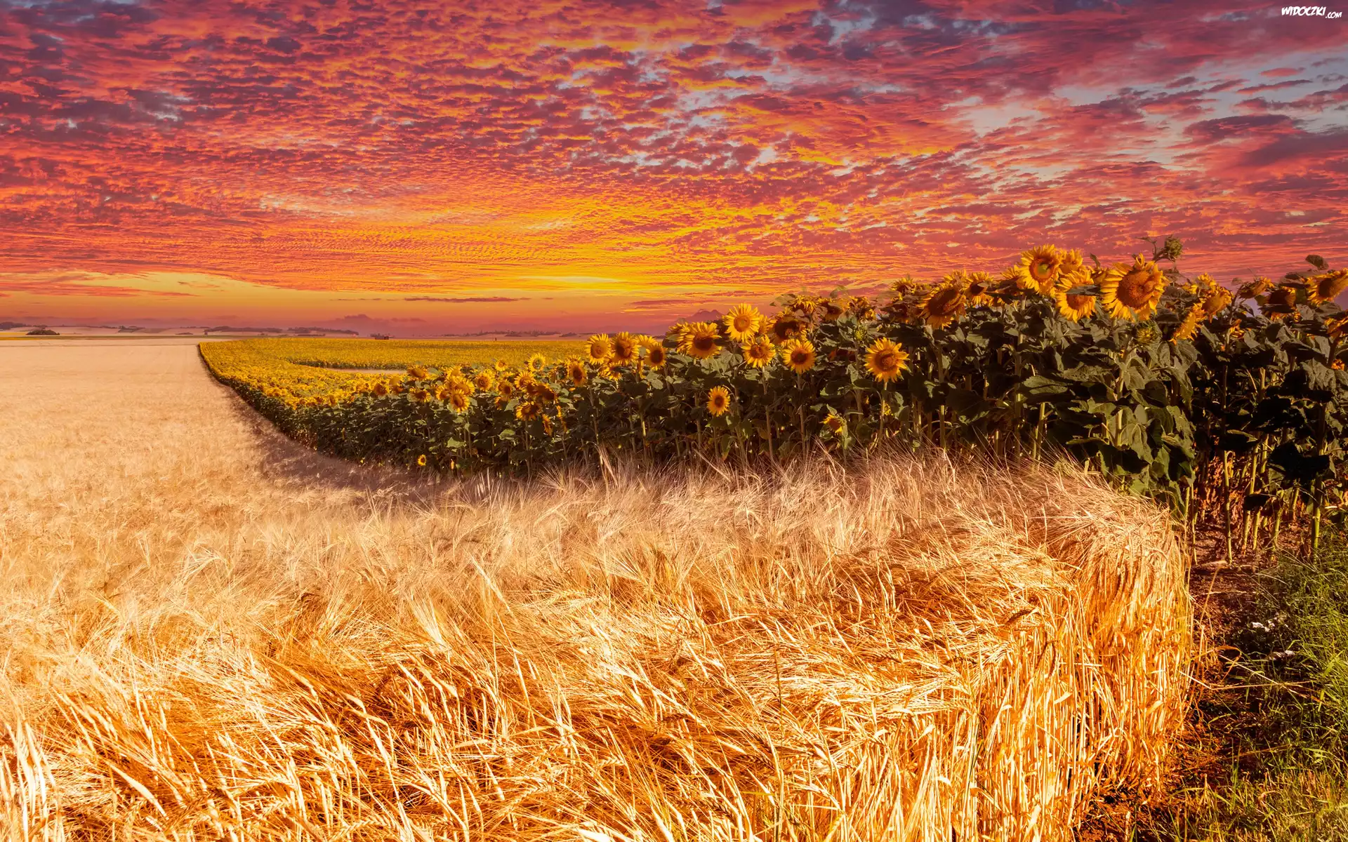 Zdjęcia, Pole, Zboże, Kłosy, Kwiaty, Słoneczniki, Plantacja, Chmury, Zachód słońca