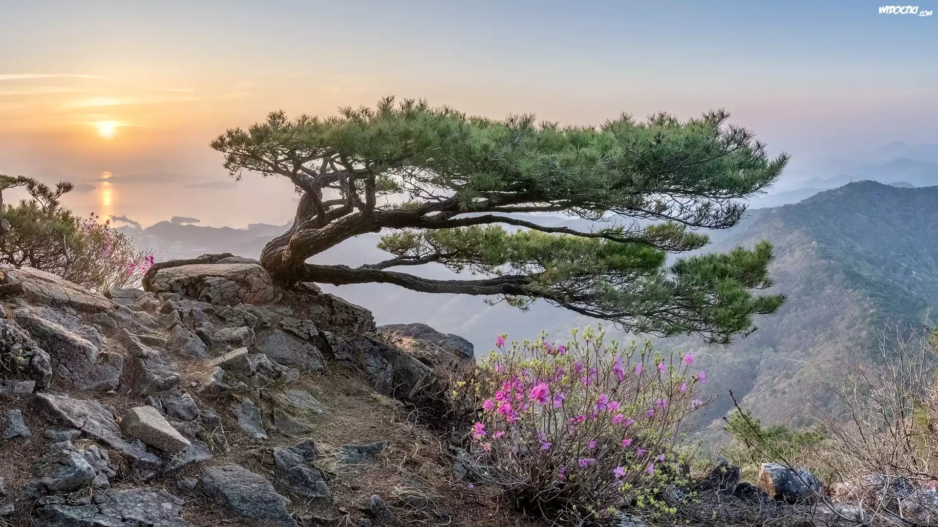 Zdjęcia, Góry, Skały, Promienie słońca, Sosna, Kwiaty