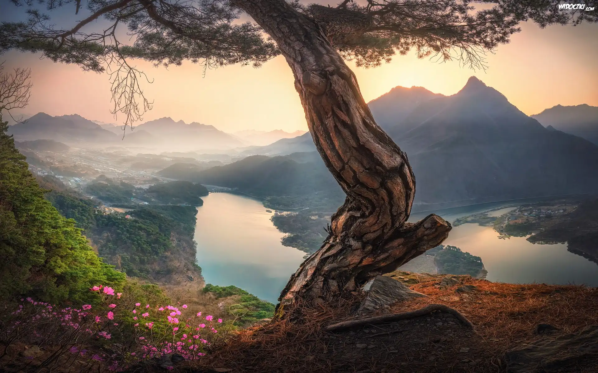 Góry, Rzeka, Zachód słońca, Sosna, Kwiaty