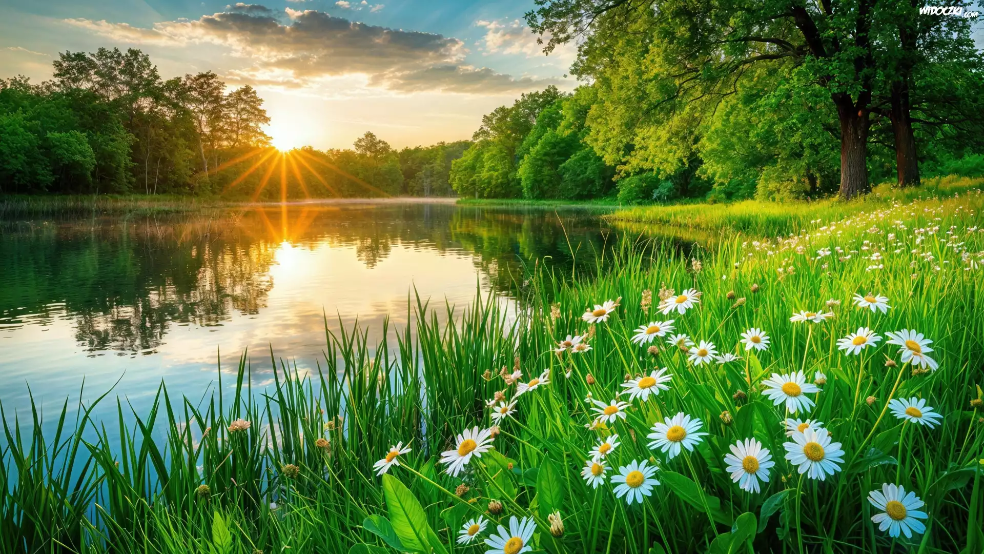 Zdjęcia, Drzewa, Jezioro, Łąka, Trawa, Kwiaty, Chmury, Zachód słońca