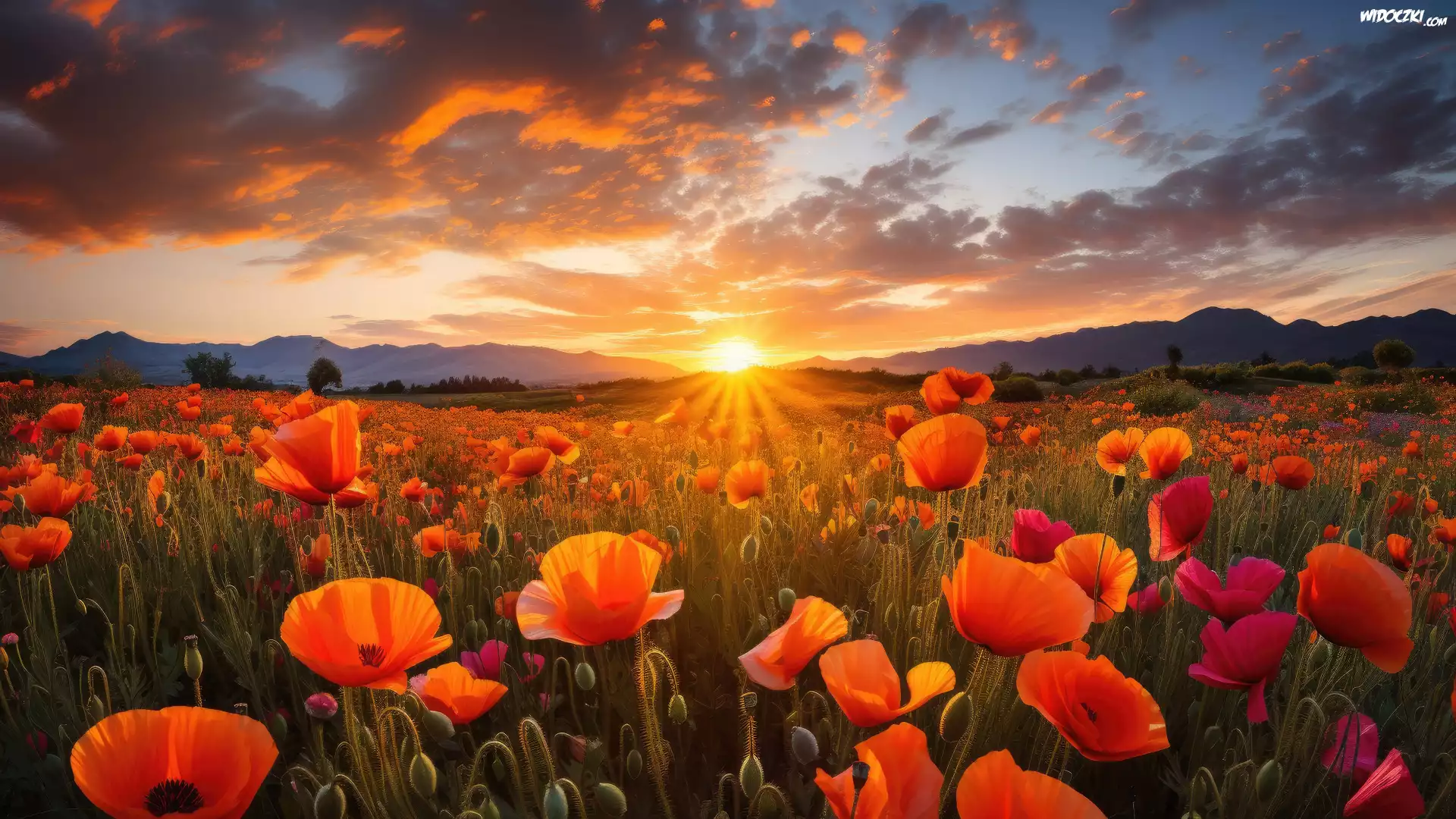 Kwiaty, Maki, Łąka, Góry, Chmury, Lato, Zachód słońca