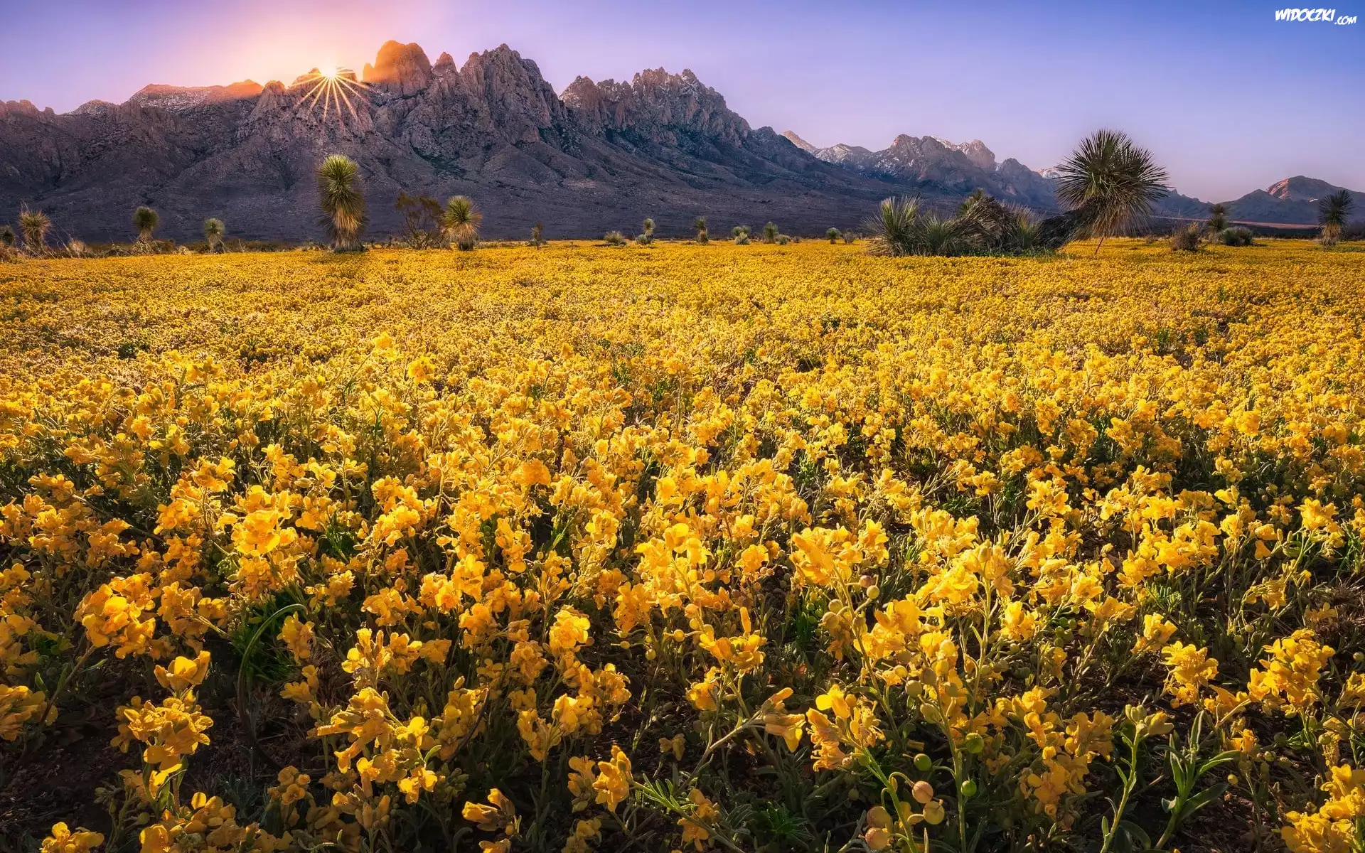 Zdjęcia, Góry, Skały, Łąka, Żółte, Kwiaty, Drzewa, Promienie słońca