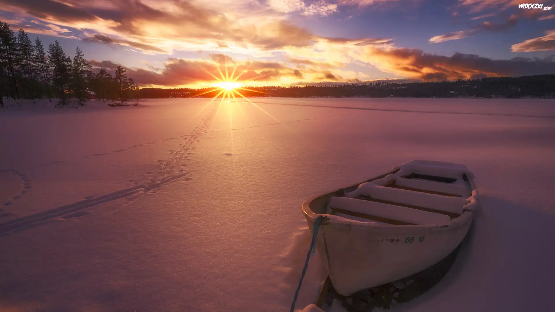 Zdjęcia, Zima, Jezioro, Łódka, Drzewa, Las, Wschód słońca, Chmury, Promienie słońca