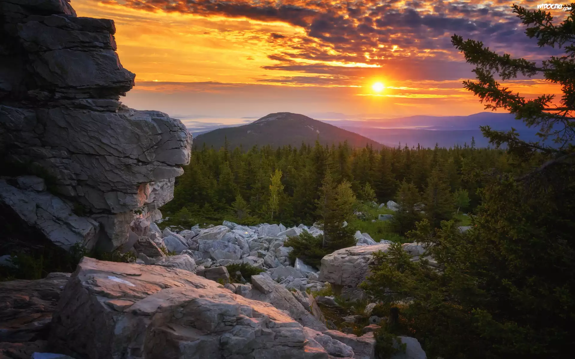 Góry, Skały, Las, Drzewa, Niebo, Chmury, Zachód słońca