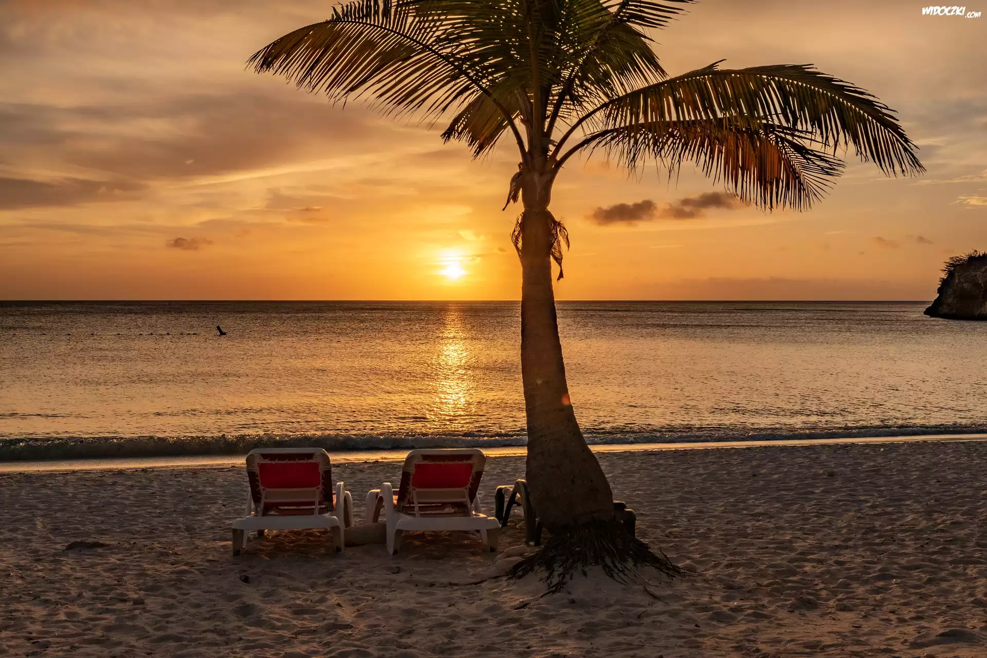 Morze, Plaża, Zachód słońca, Palma, Leżaki