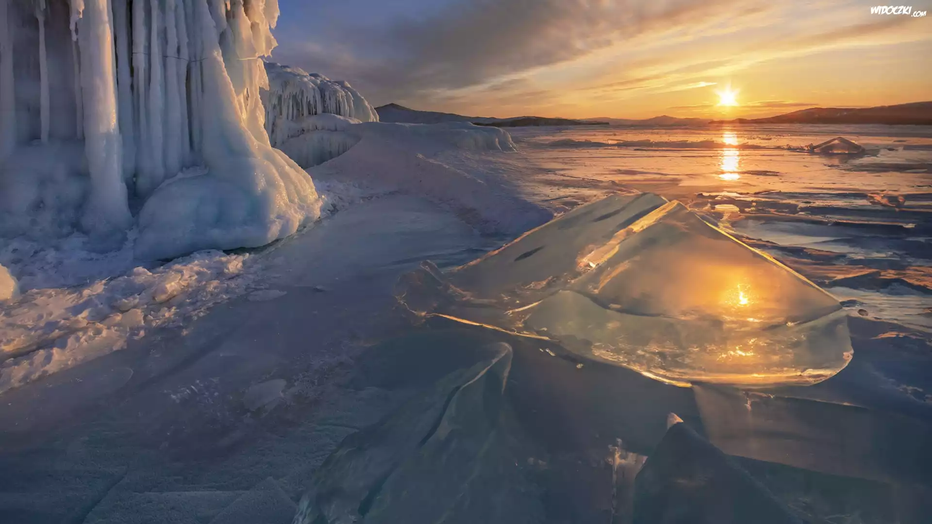 Zima, Mróz, Zachód słońca, Jezioro, Lód