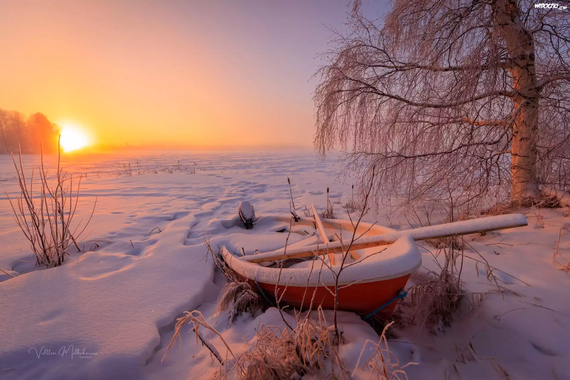 Zdjęcia, Zima, Śnieg, Łódka, Drzewo, Brzoza, Rośliny, Zachód słońca