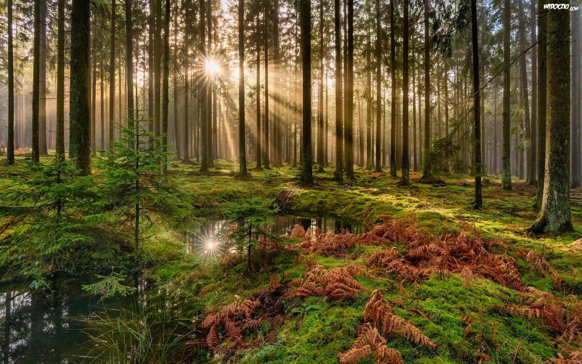 Zdjęcia, Las, Drzewa, Promienie słońca, Paprocie, Mech