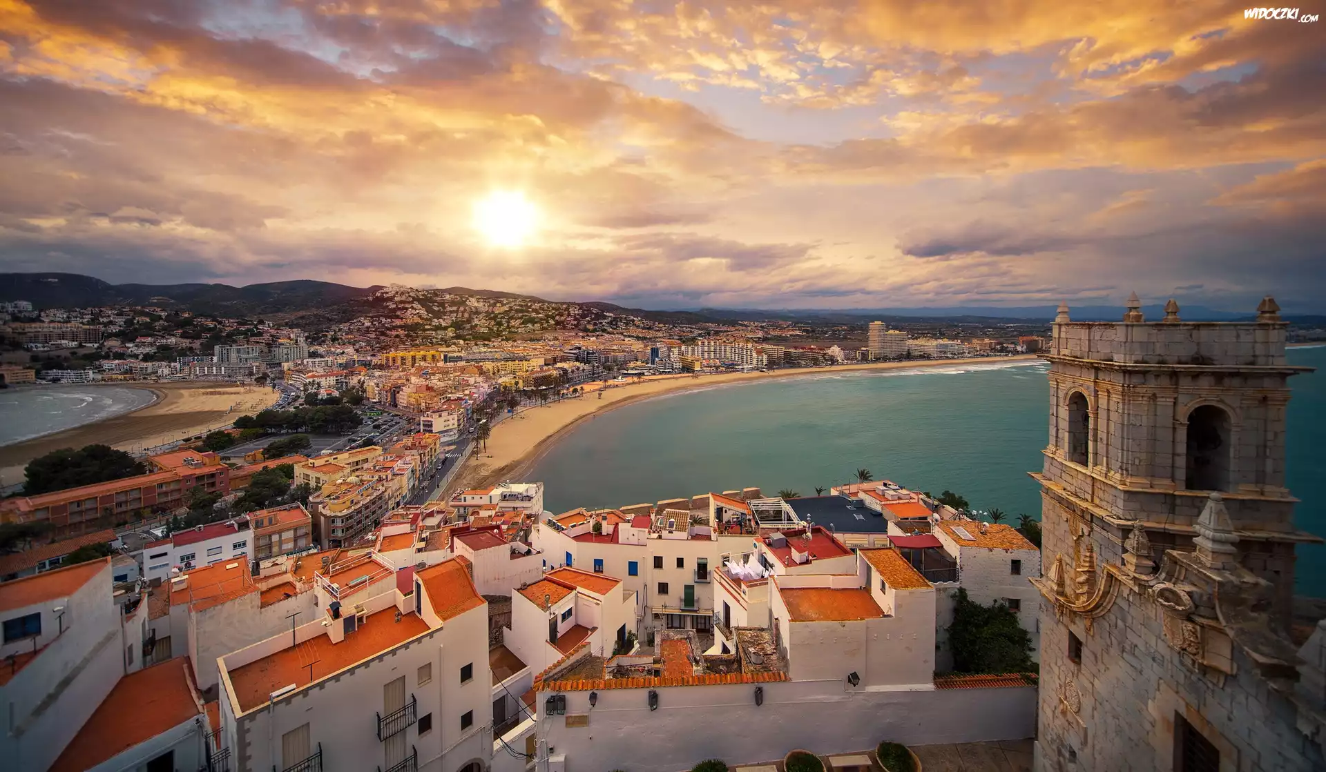 Hiszpania, Walencja, Miejscowość Peniscola, Domy, Morze, Chmury, Wschód słońca
