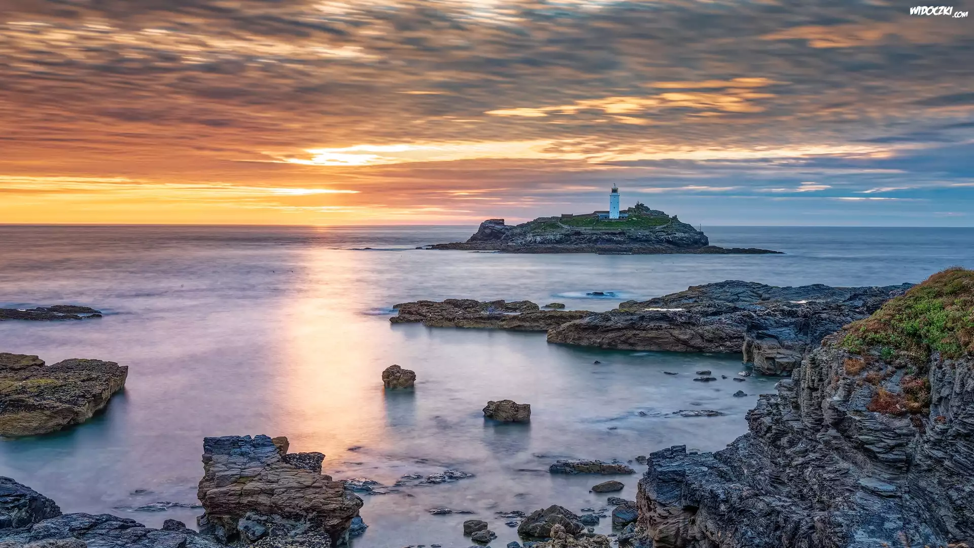 Anglia, Kornwalia, Morze, Latarnia morska Godrevy, Skały, Chmury, Zachód słońca