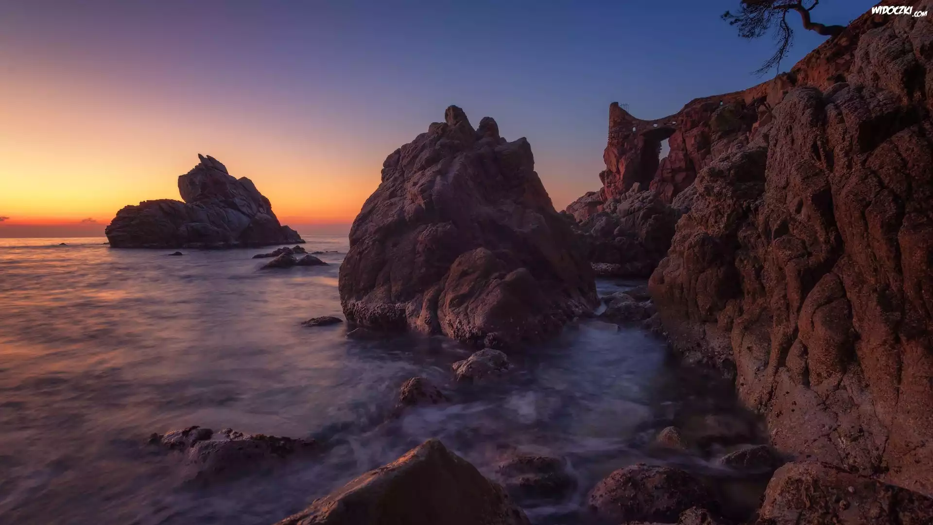 Zdjęcia, Zachód słońca, Morze, Skały, Drzewo